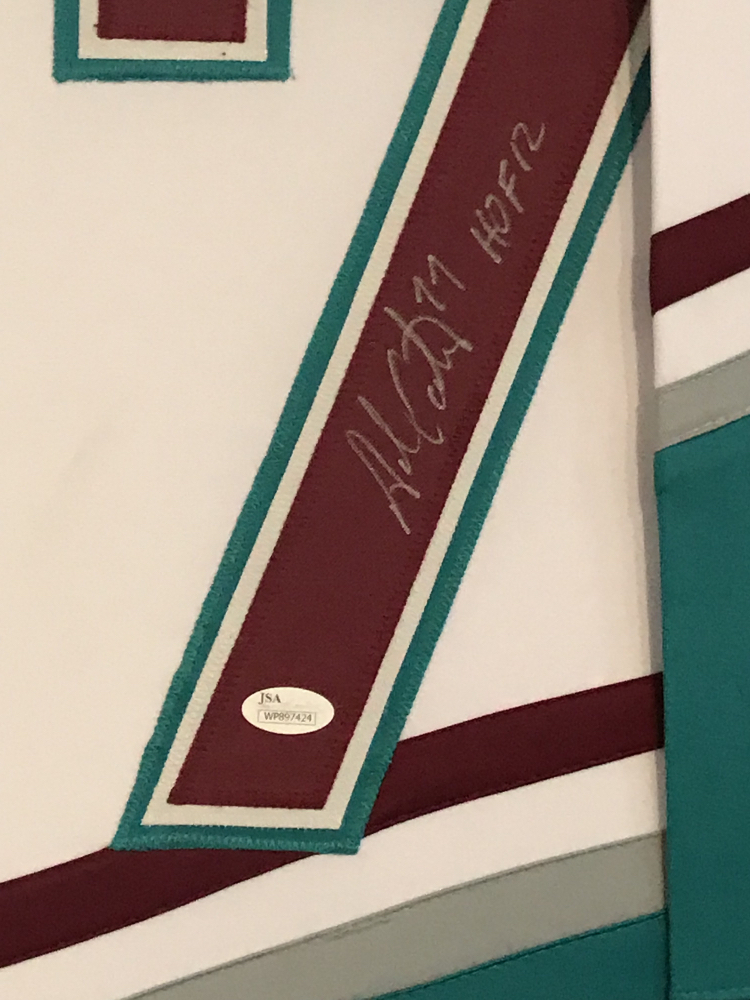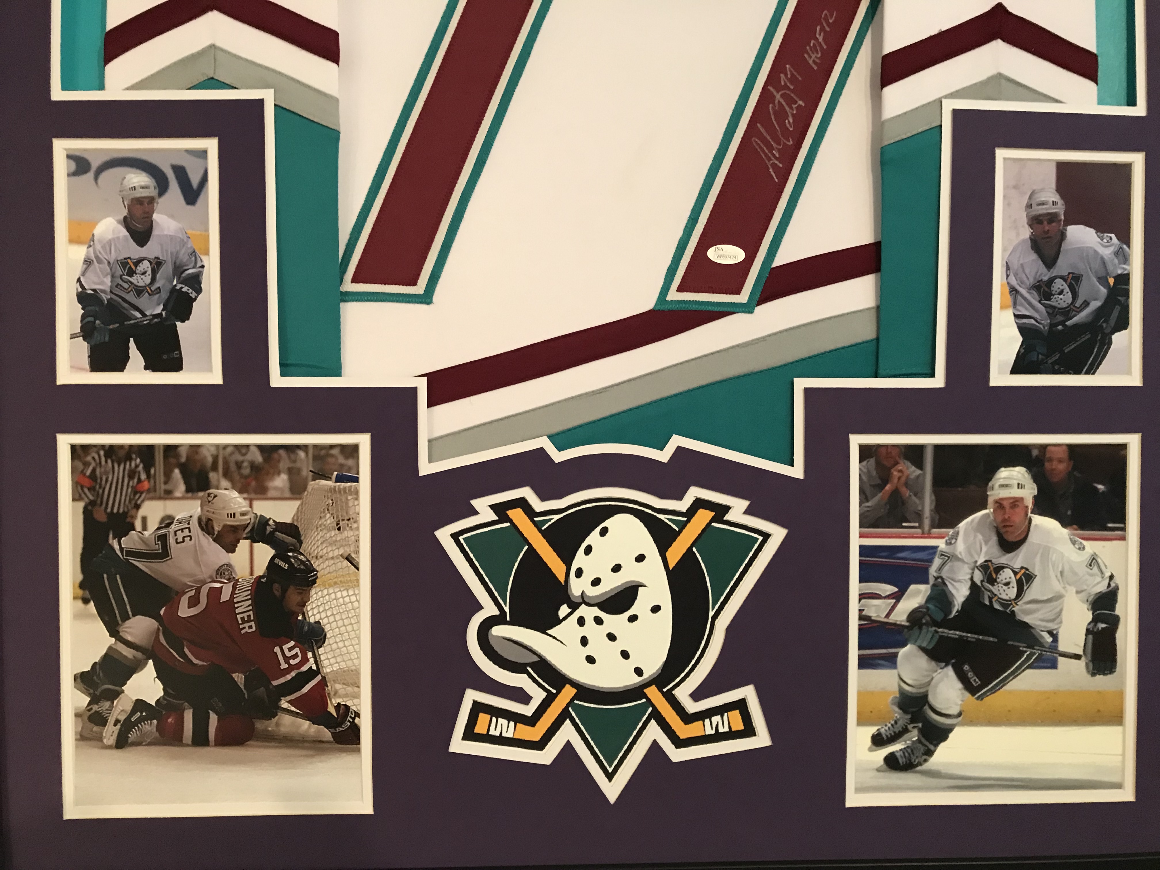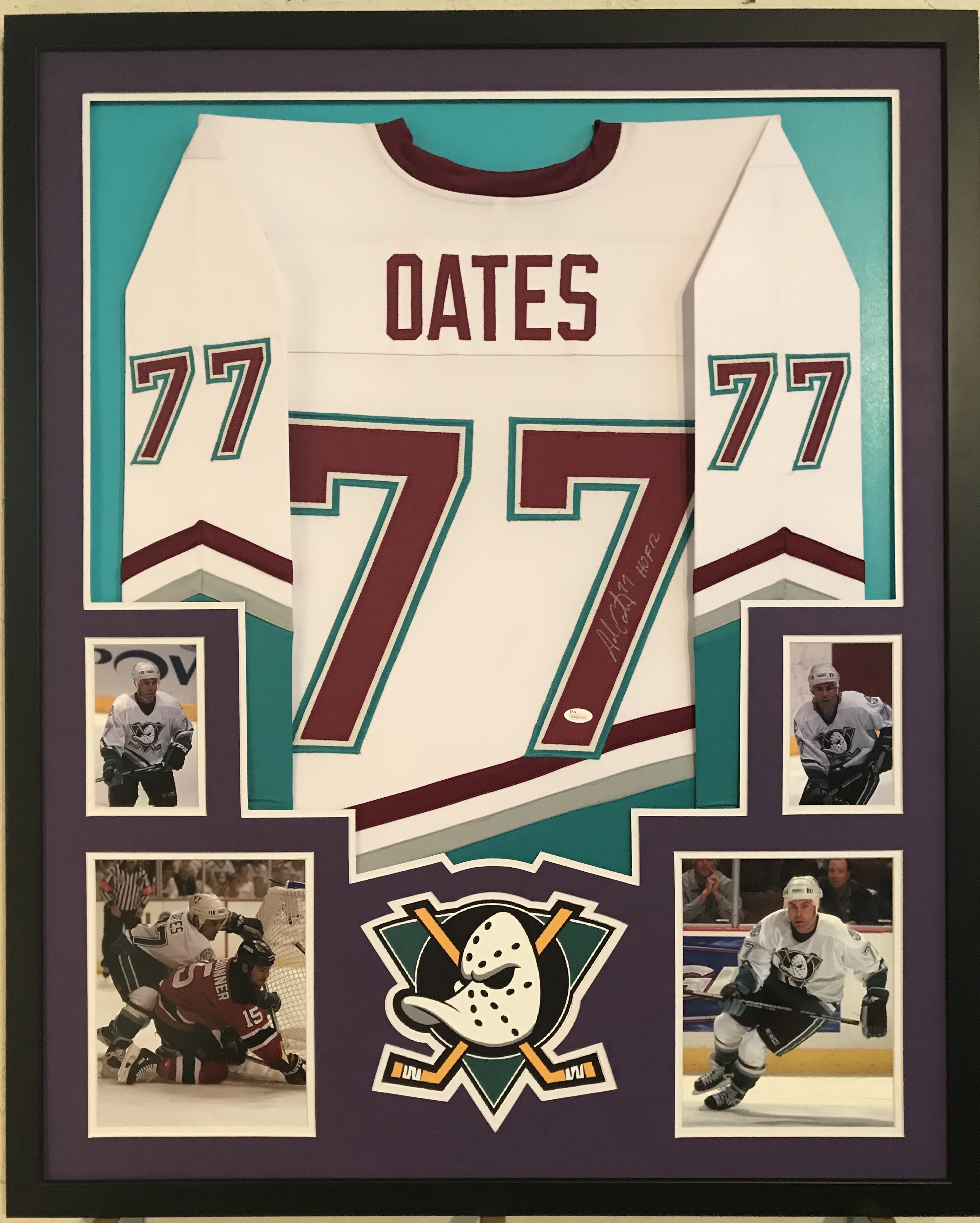 Custom frame measures 34" x 42" in size. Features a jersey that has been hand-signed and inscribed by Adam Oates (HOF).