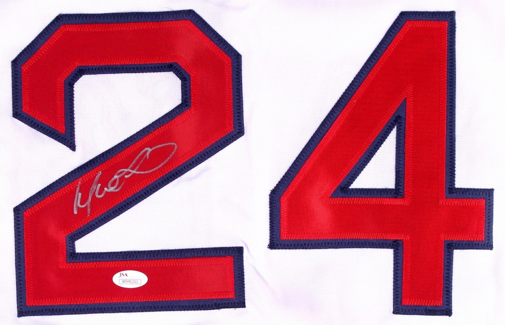 Custom on-field style jersey. Everything is sewn on, size XL. Hand-signed in silver paint pen by Manny Ramirez (Red Sox, Indians). The autograph includes an official James Spence Authentication (JSA) hologram and matching COA for authenticity purposes. The signing of this item was witnessed by JSA.
