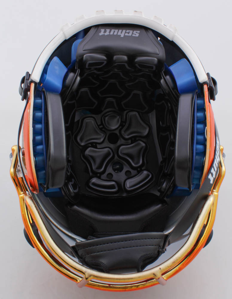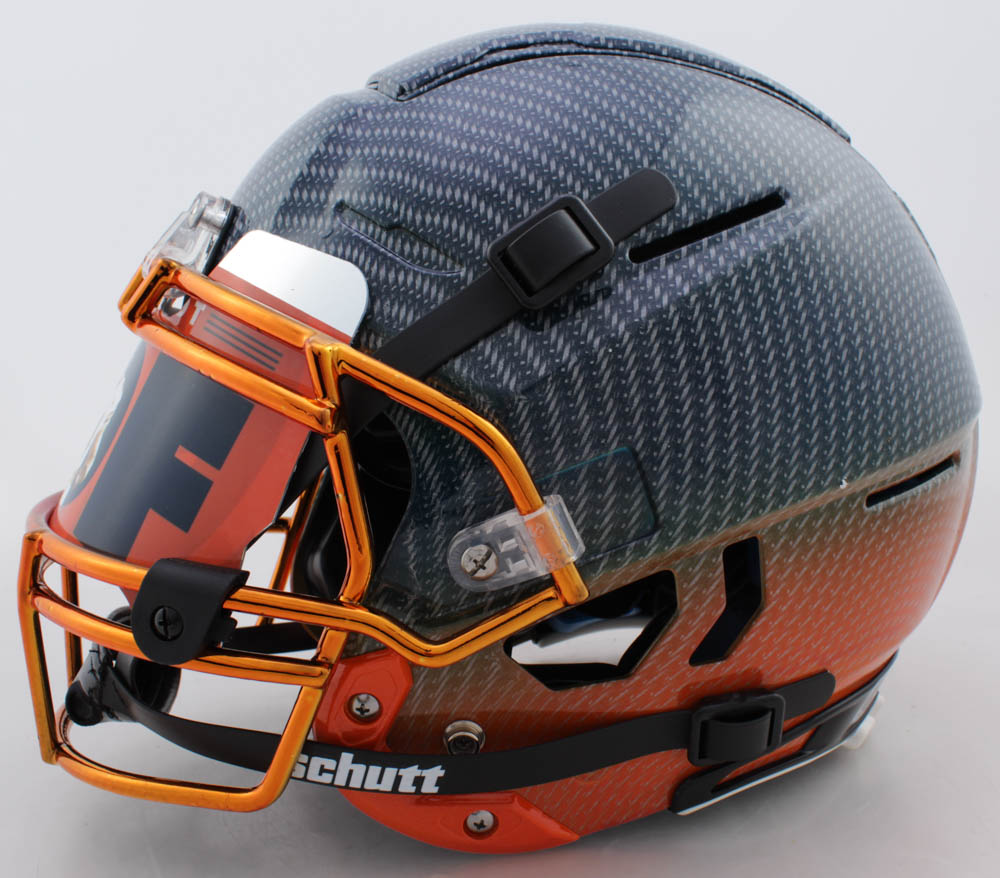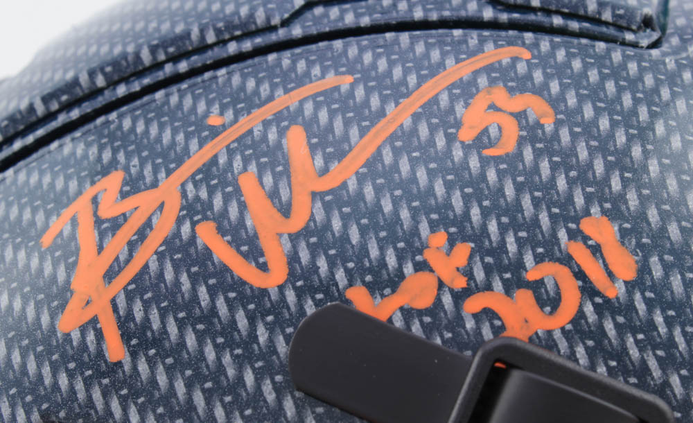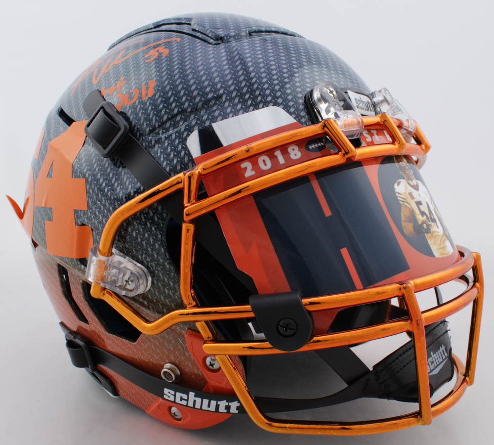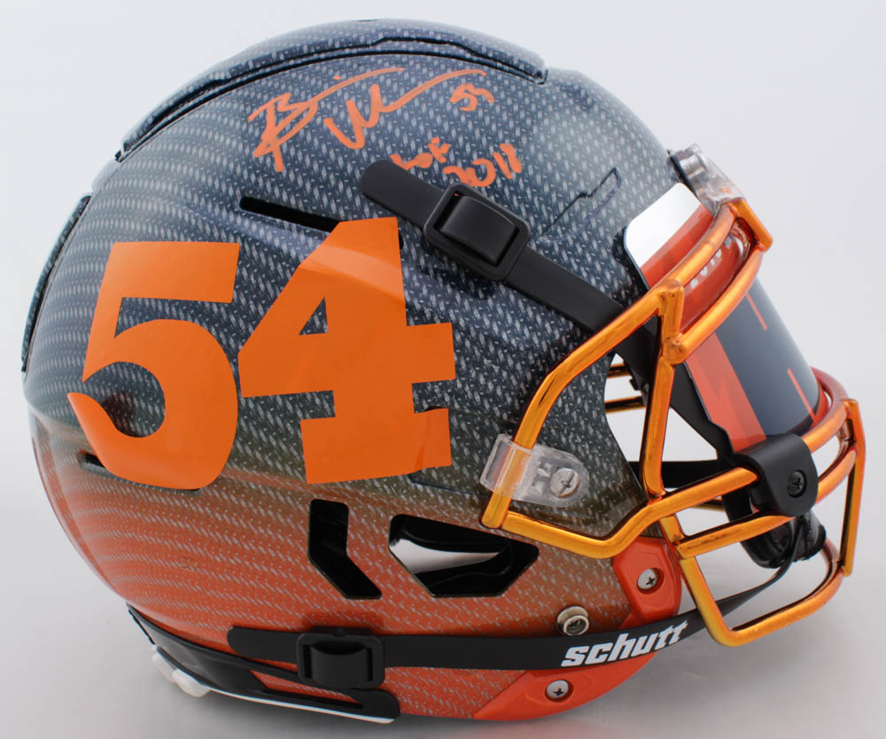 Schutt full-size authentic on-field hydro-dipped F7 helmet. Hand-signed and inscribed by Brian Urlacher (HOF). Helmet includes Urlacher Visor. Please see images for details regarding the condition of the helmet.