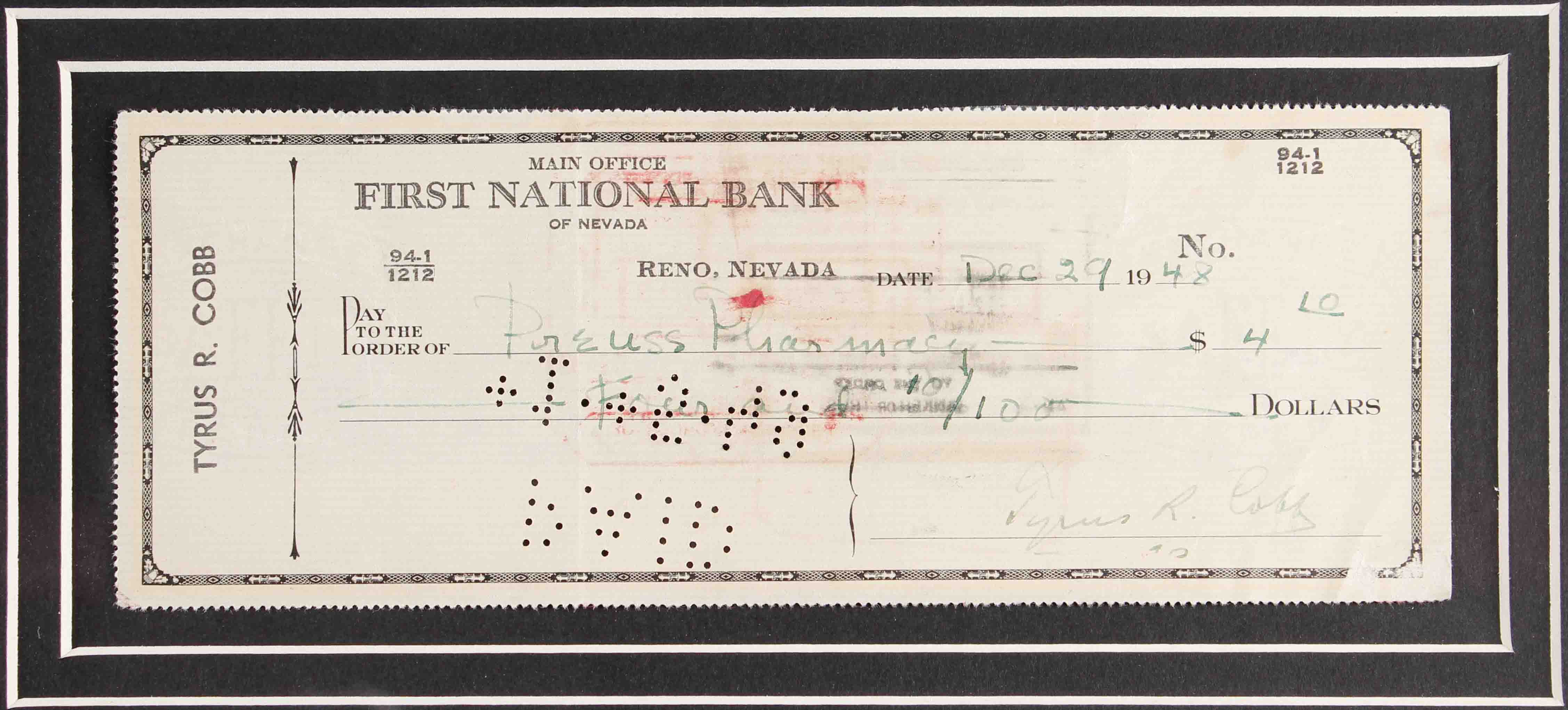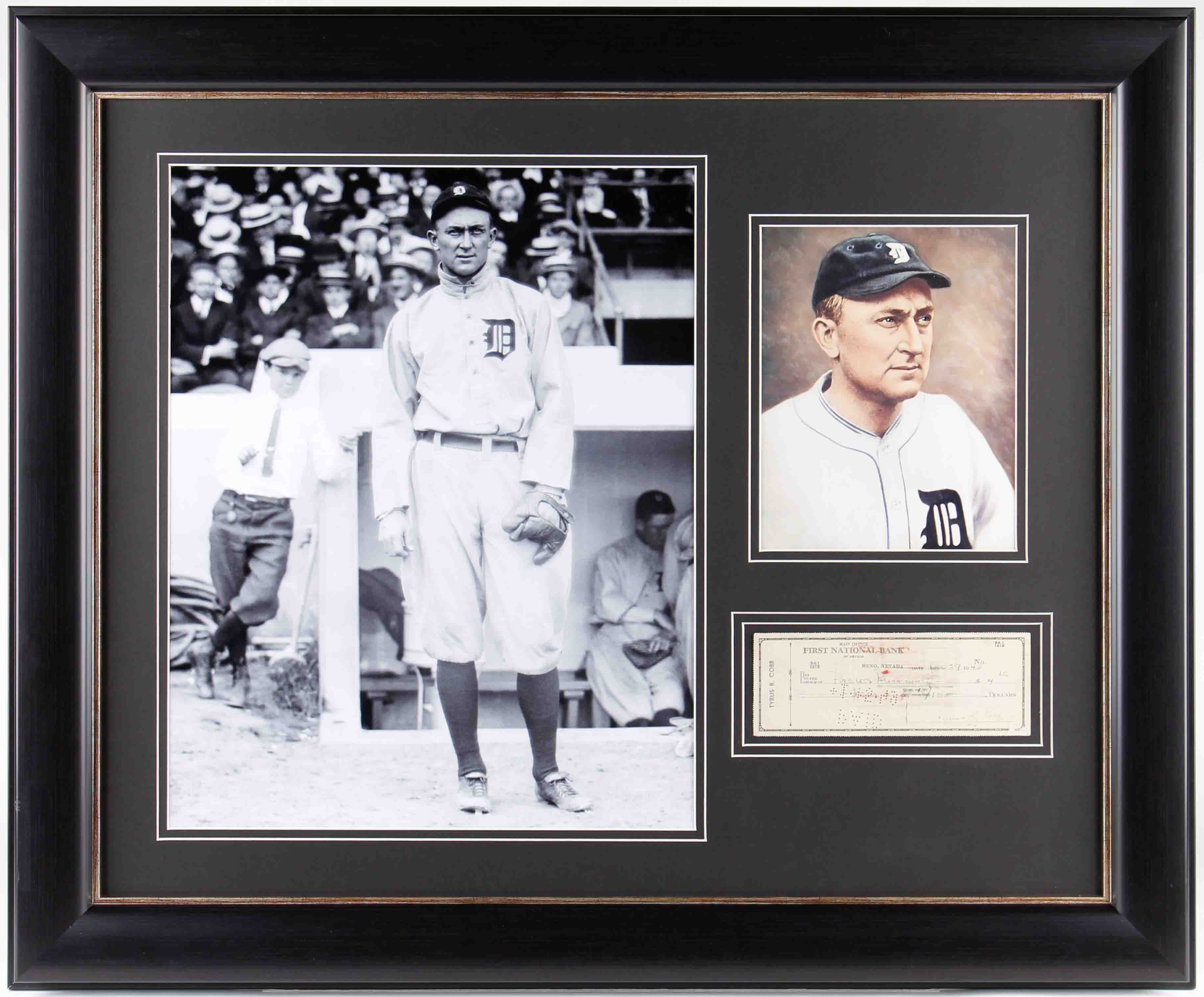 Custom frame measures 29" x 35" in size and features a check that has been hand-signed by Ty Cobb (D. 1961, Detroit Tigers, HOF). Please see images for details regarding the condition of the frame.