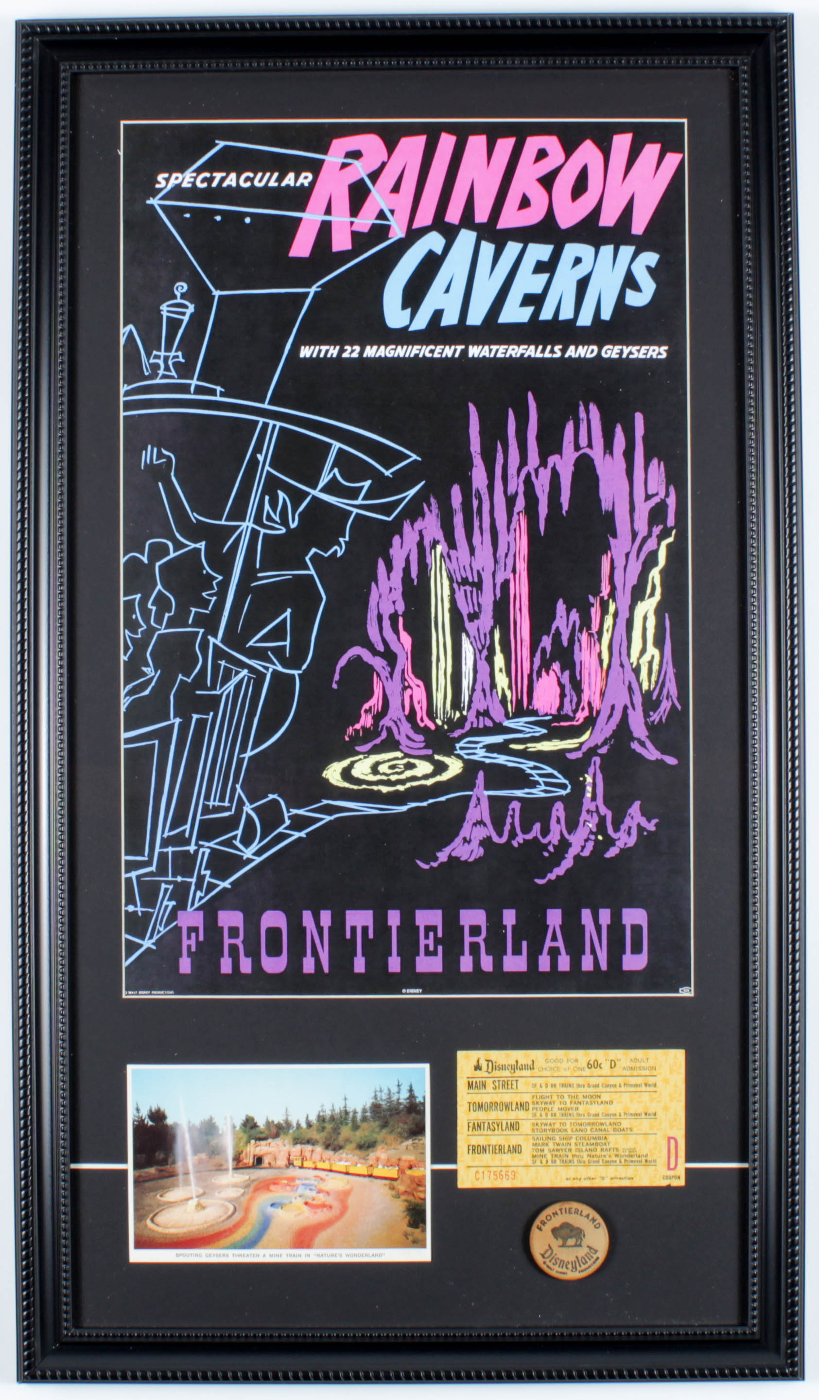 Custom frame measures 15" x 26" in size and features a vintage print of Disney World's Frontierland. Display also features a Vintage Disneyland "D" Mine Train Ticket, Vintage Souvenir Postcard and Wooden Nickel.