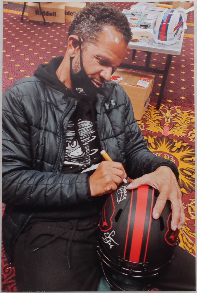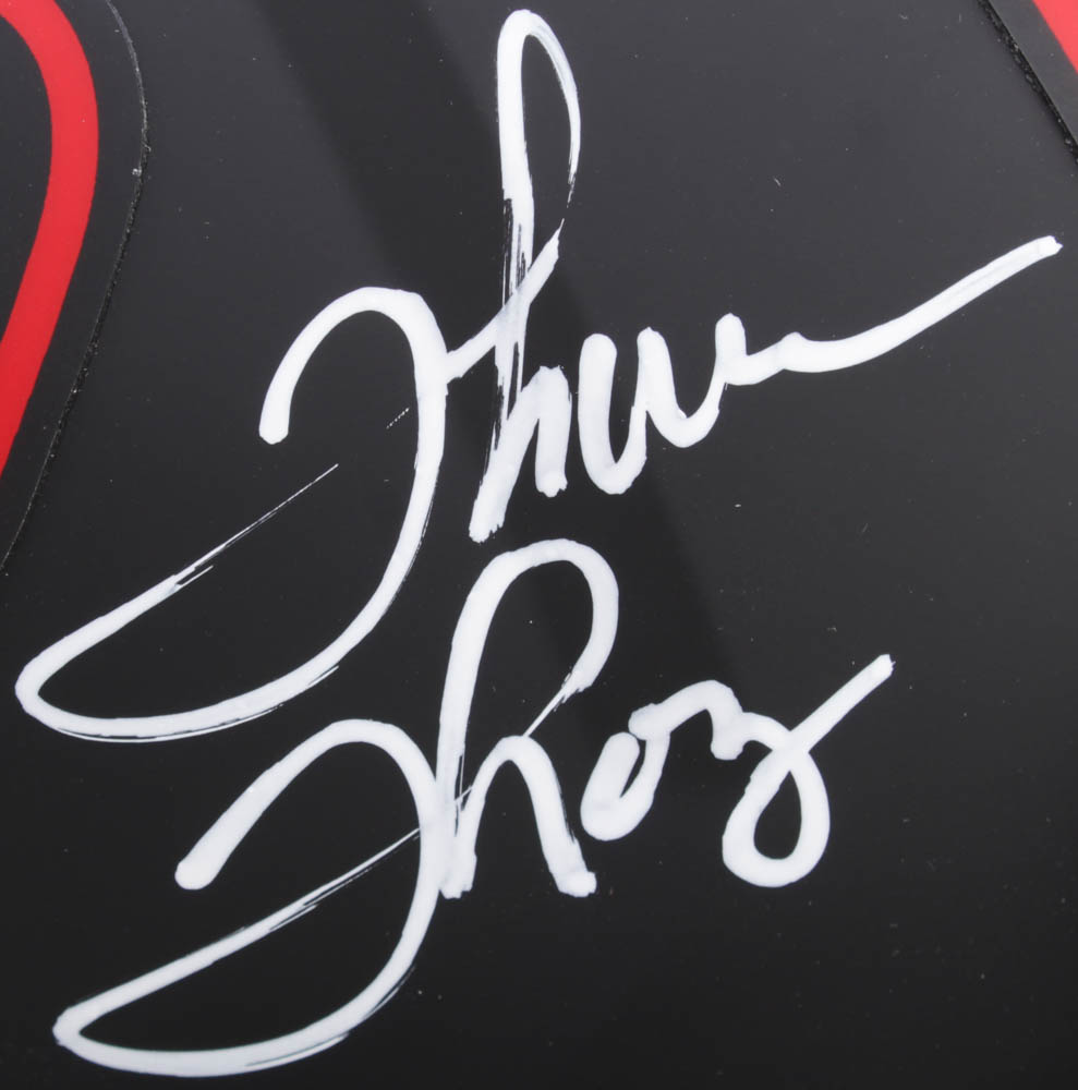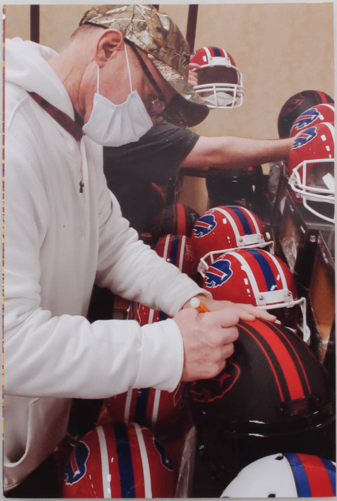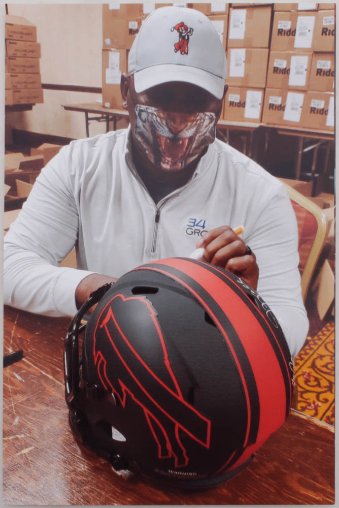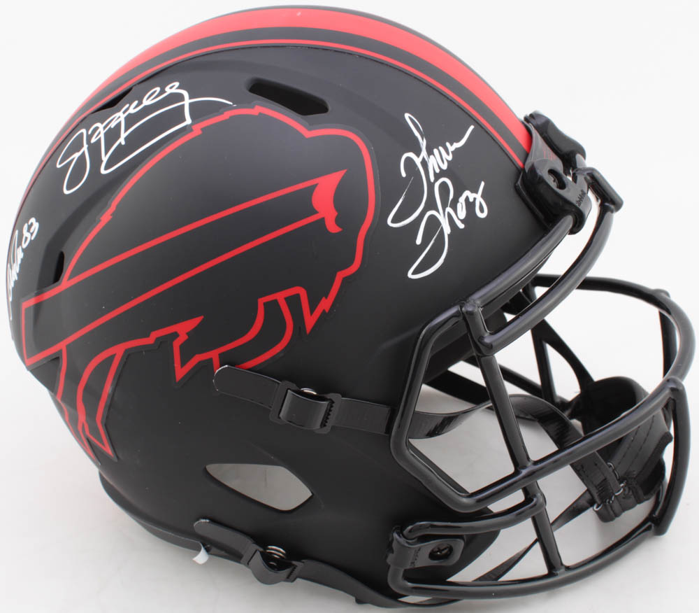 Buffalo Bills full-size replica Eclipse Alternate Speed helmet. Hand-signed by Jim Kelly (HOF), Thurman Thomas (HOF), and Andre Reed (HOF).