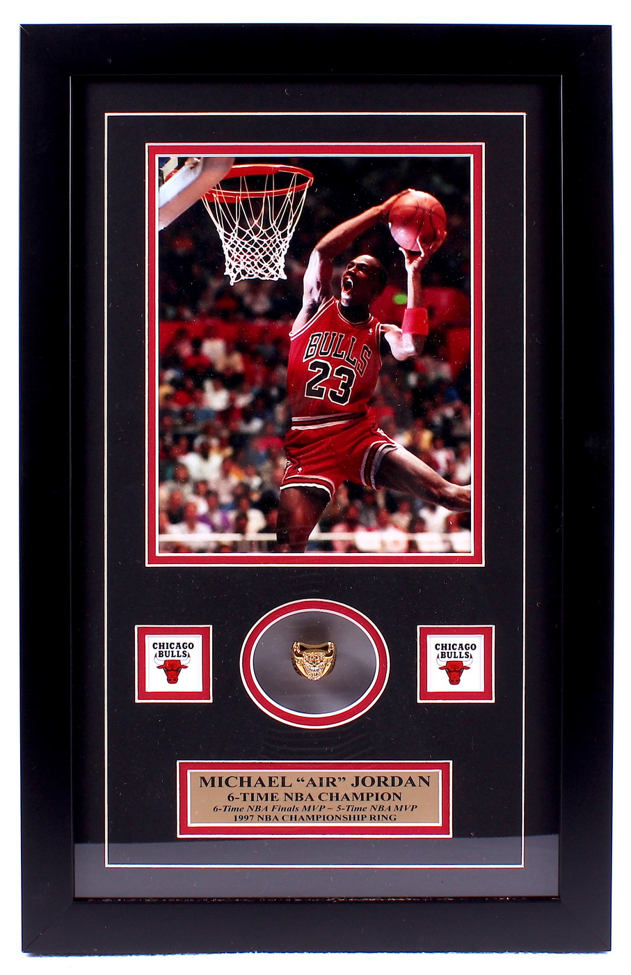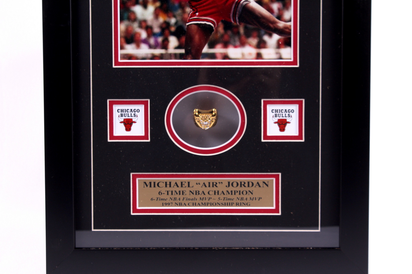 Custom framed championship ring display measures 14" x 22" in size and features a Michael Jordan Chicago Bulls High Quality Replica 1997 NBA Championship Ring. The display also contains an 8" x 10" photo of Michael Jordan. Please note that the display is unsigned.