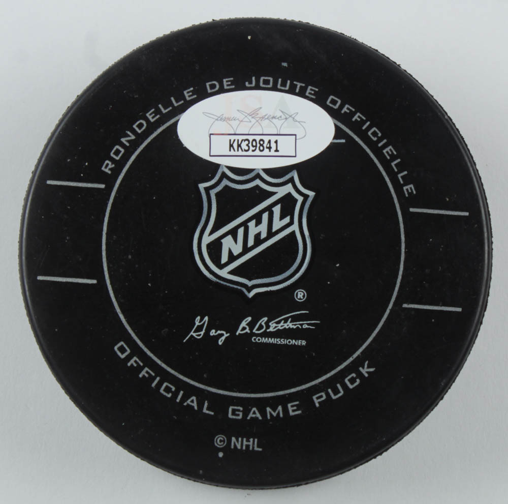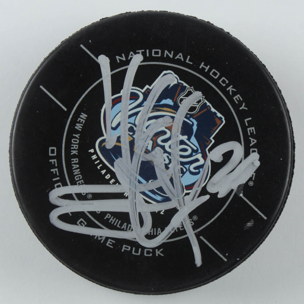 New York Rangers logo hockey puck. Hand-signed by Henrik Lundqvist.