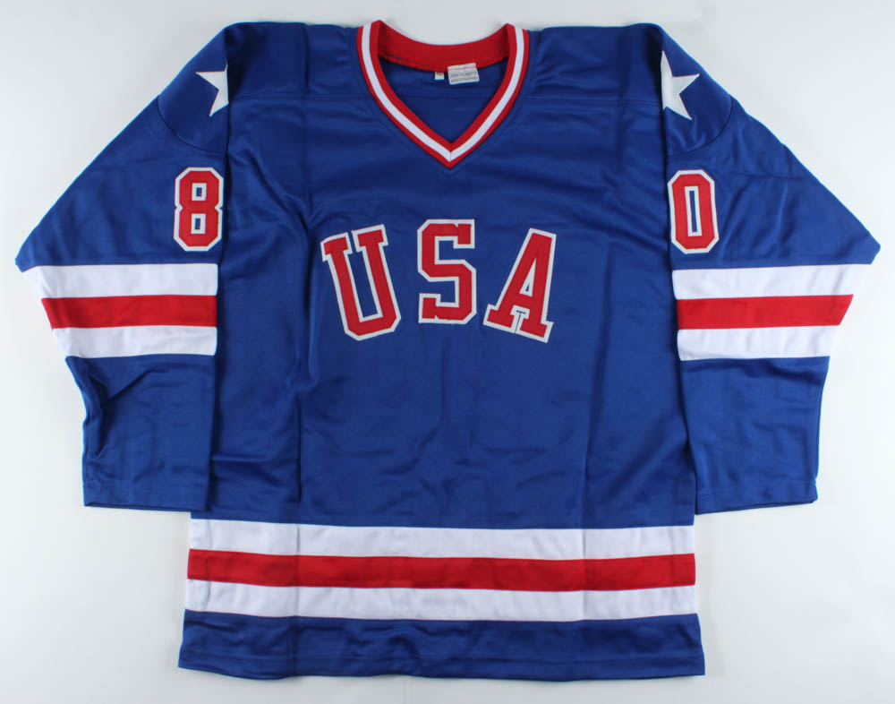 Custom on-ice style jersey. Everything sewn on, size XL. Hand-signed by (17) members of the 1980 USA Hockey Team. The autographs include Jim Craig, Mike Eruzione, Neal Broten, Mark Johnson, Dave Christian, Eric Strobel, Dave Silk, Mark Wells, Jack O'Callahan, Buzz Schneider, and (7) others.