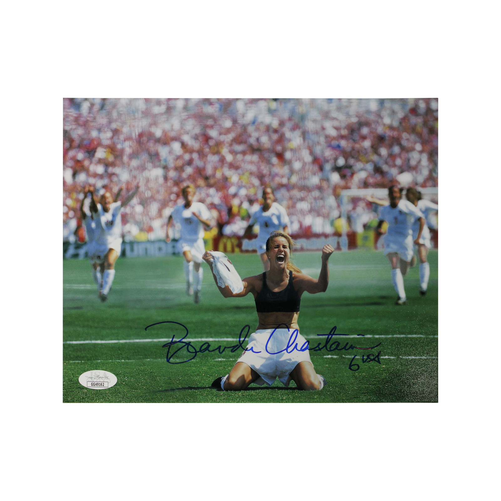 Photo measures 8" x 10" in size and has been hand-signed and inscribed by Brandi Chastain.