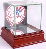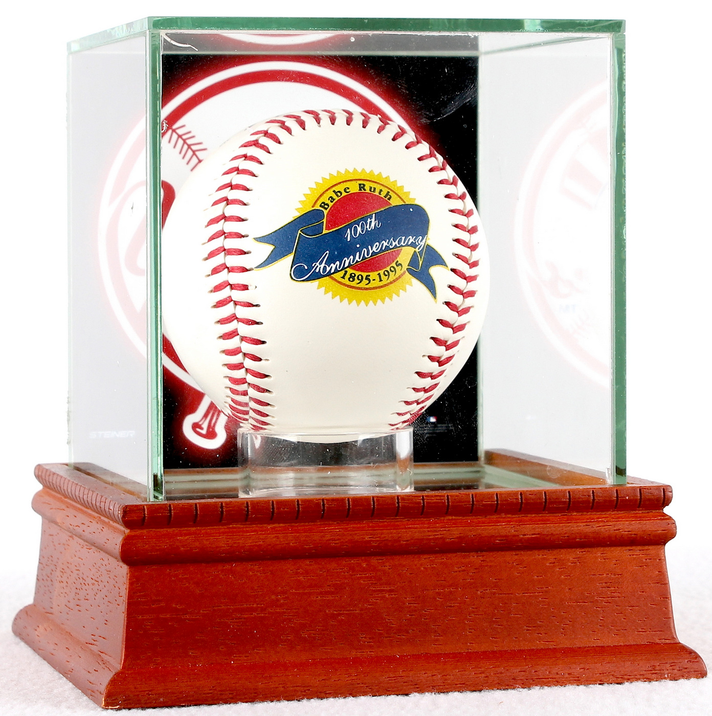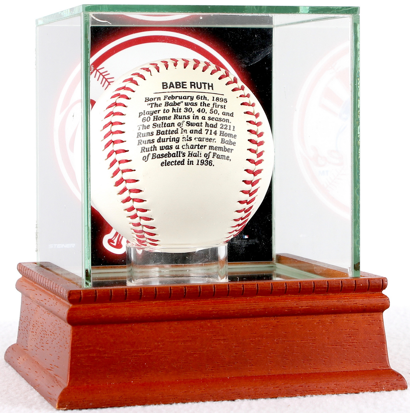 Babe Ruth commemorative baseball. The auction includes a Steiner display case with a wood base and glass cube. Also includes a 4" x 4" New York Yankees photo from Steiner that has been attached to the case. Please note that the baseball is not signed. Please see photos for more details regarding the baseball and the case.
