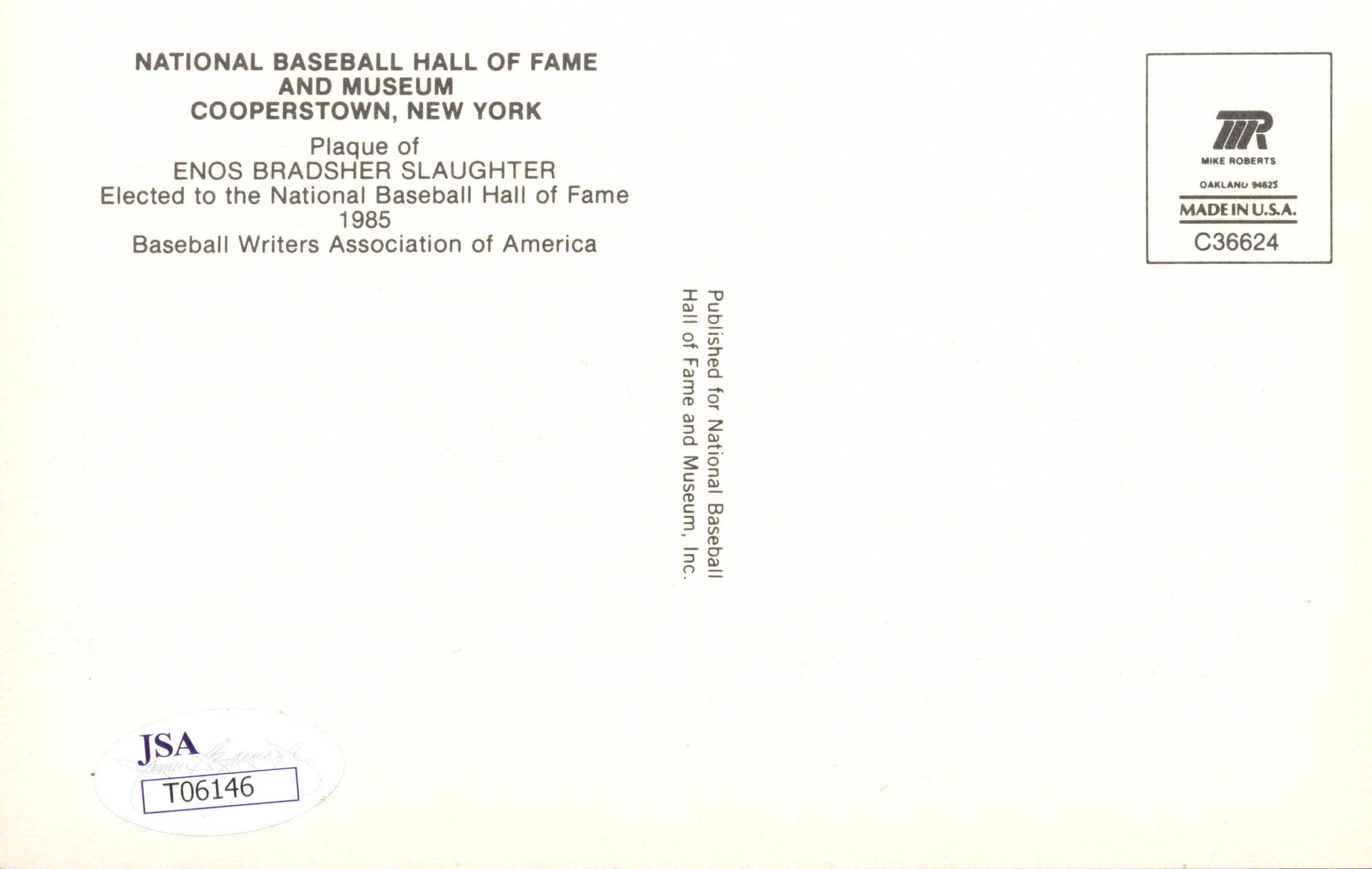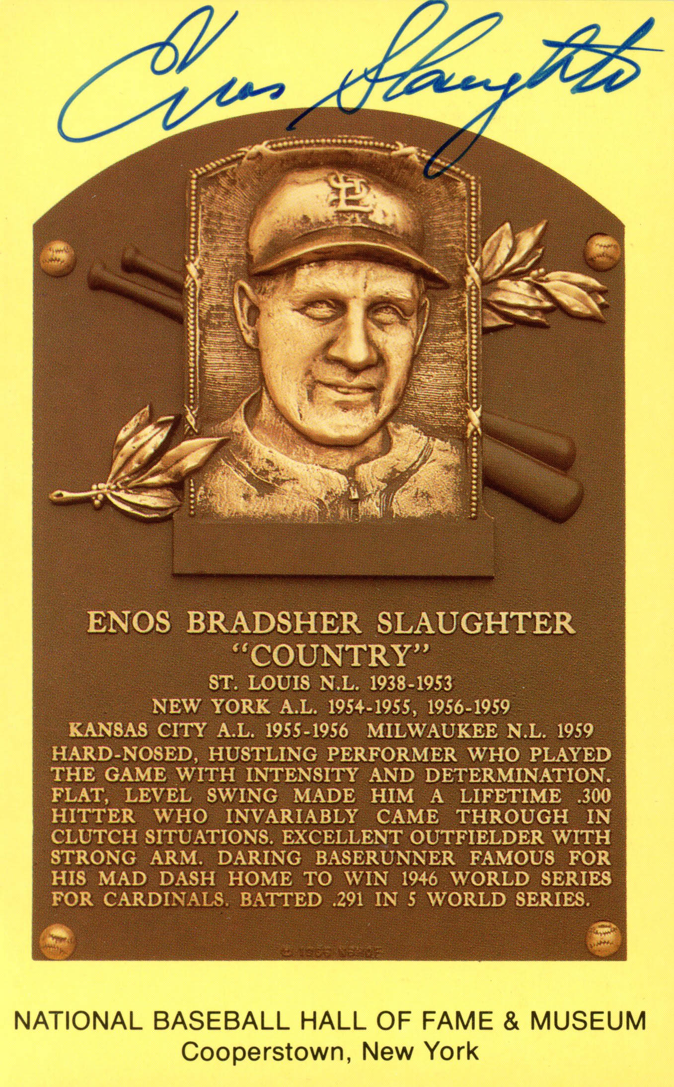 Enos Slaughter Signed Hall of Fame Plaque Postcard (JSA COA)