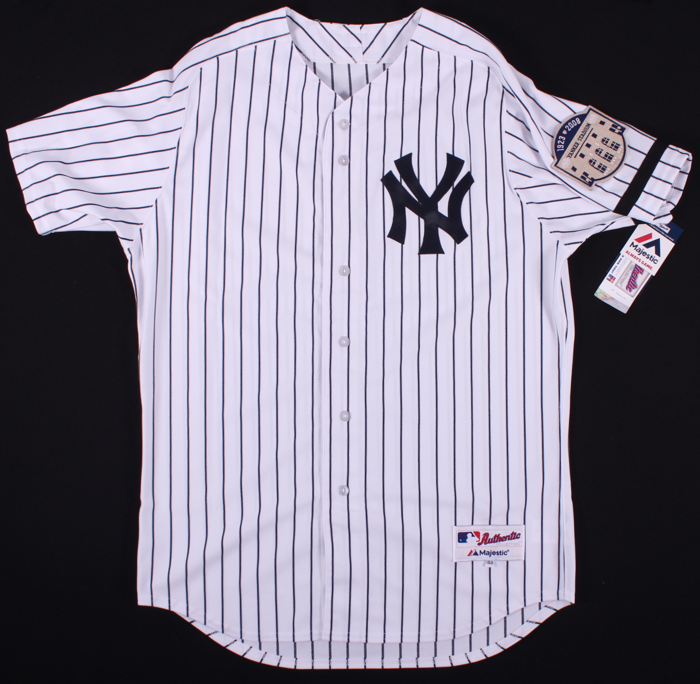 Majestic authentic on-field style jersey. Everything sewn on, size 48. Hand-signed in silver paint pen by Derek Jeter (Yankees). The sleeves of the jersey includes a 2008 All Star Game patch, a Final Season patch, and a black armband.
