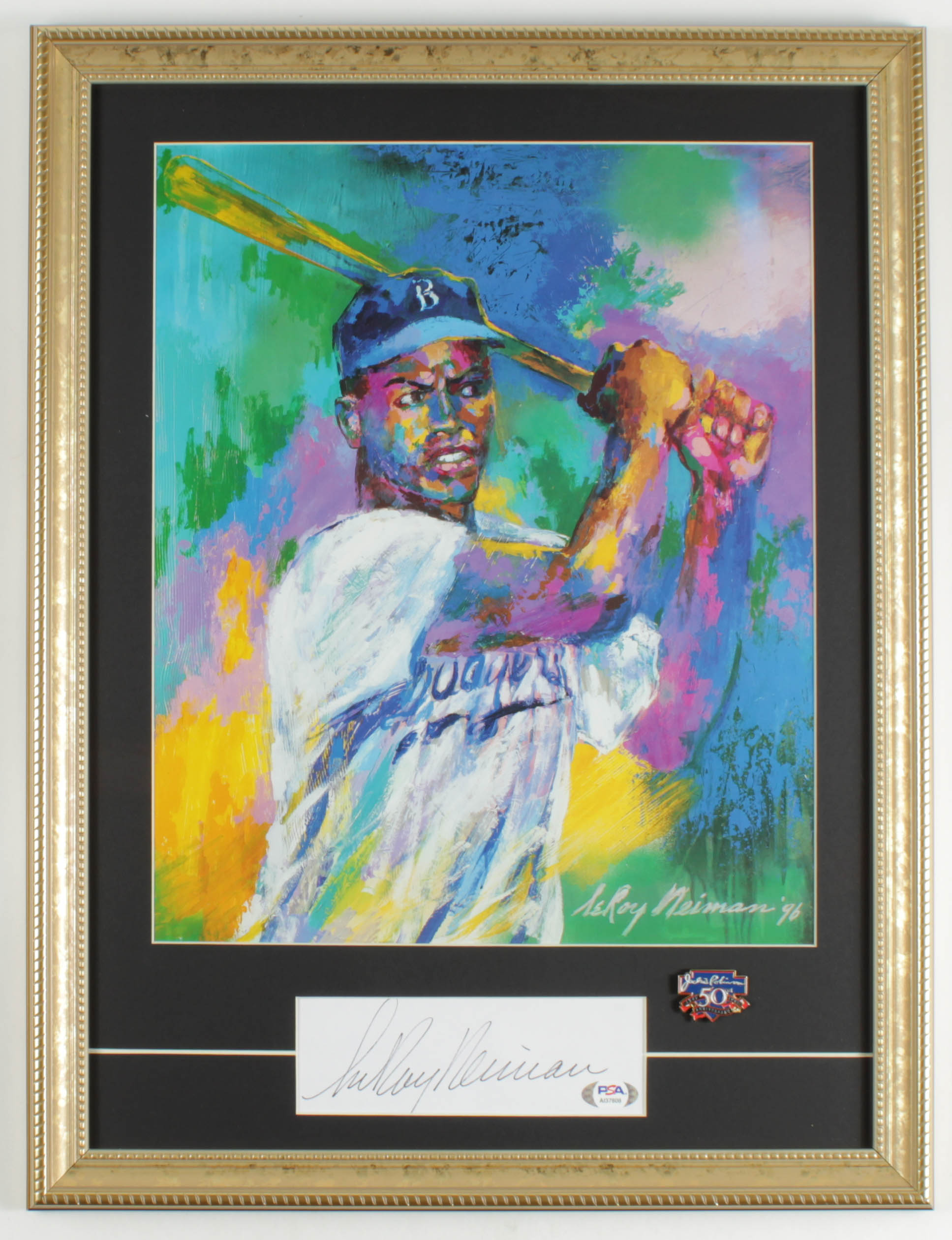 Custom frame measures approximately 16" x 21" in size and features a vintage lithograph of Jackie Robinson. Display also features a 50th Anniversary pin and a 2" x 6" cut that has been hand-signed by LeRoy Neiman.
