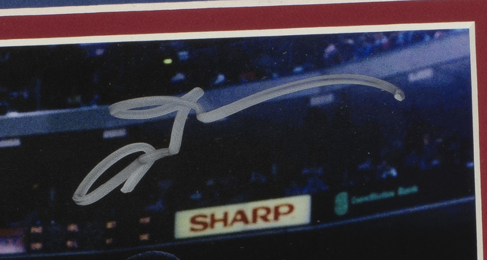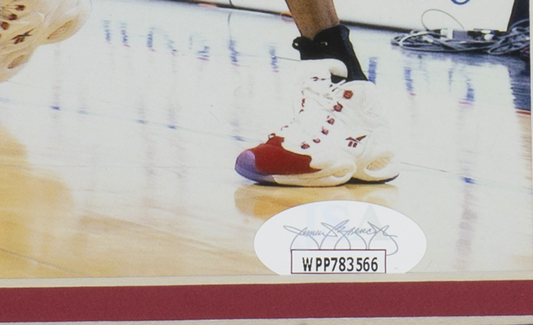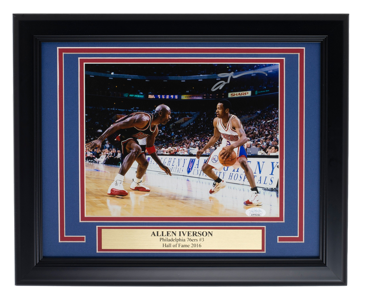 Custom framed display measures 11" x 14" in size and features a photo that has been hand-signed by Allen Iverson (Philadelphia 76ers, HOF).
