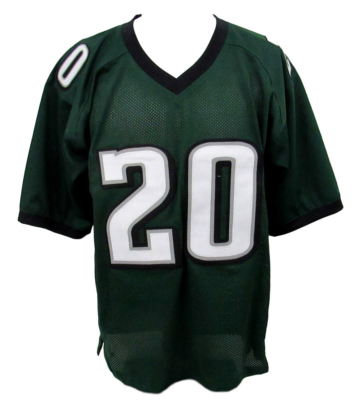 Custom on-field style jersey. Everything is sewn on, size XL. Has been hand-signed by Brian Dawkins (HOF).