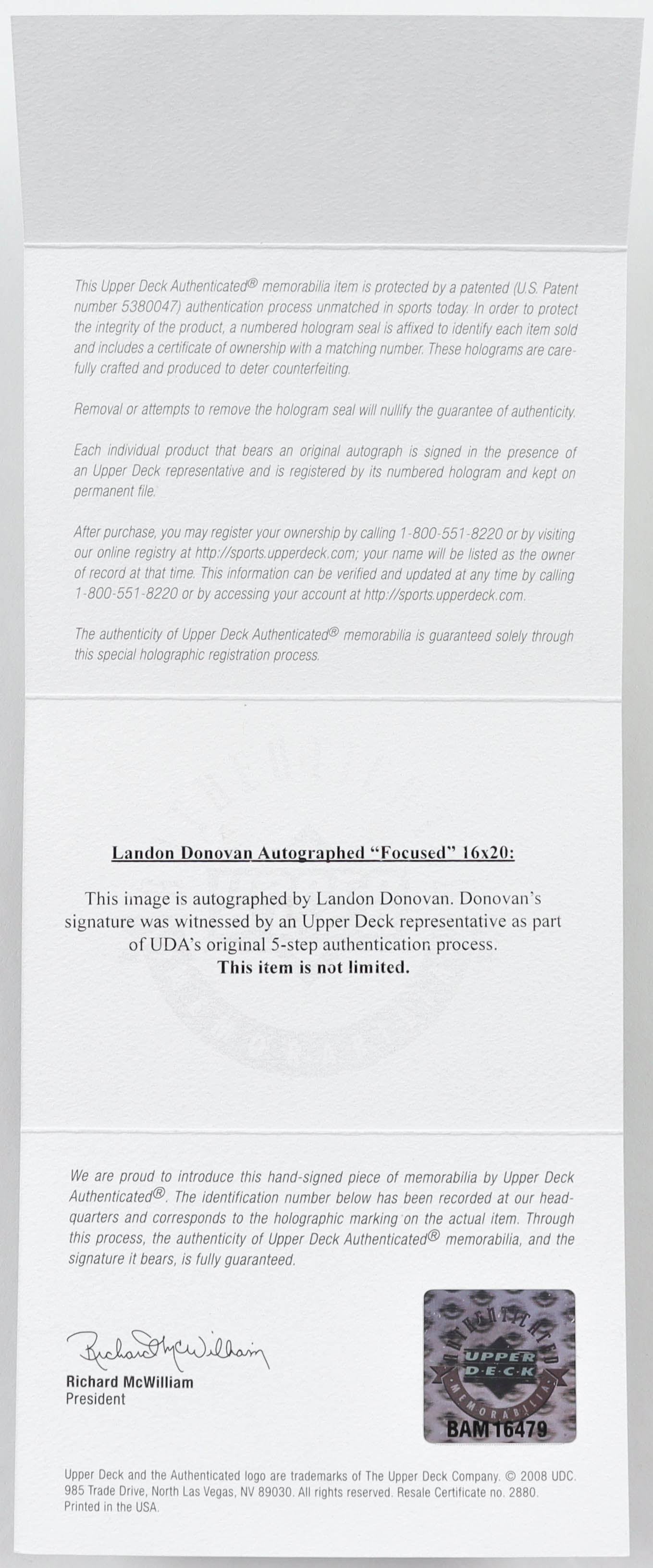 Photo measures 16" x 20" and has been hand-signed and inscribed by Landon Donovan.