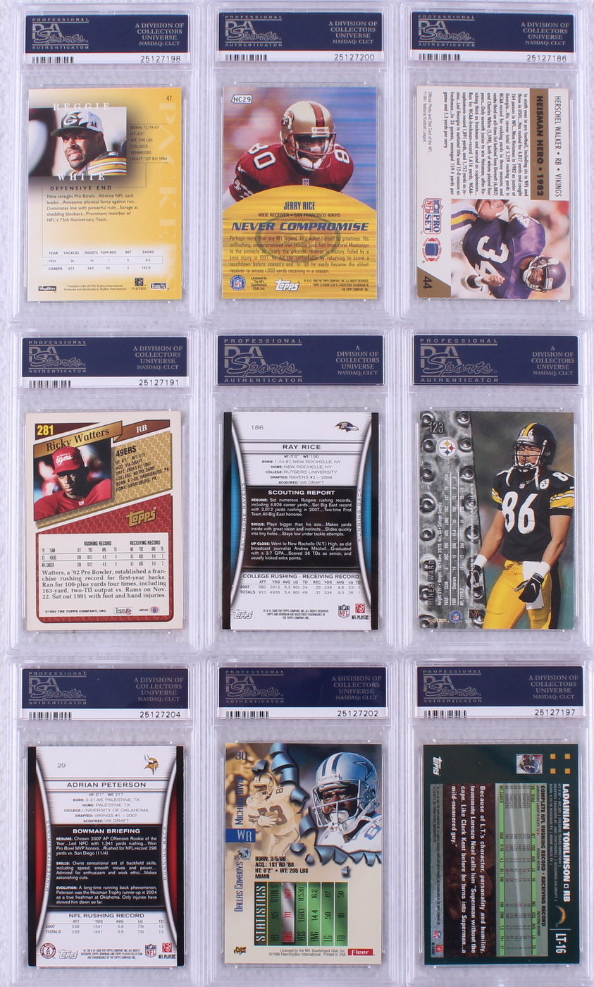 Lot of (9) PSA Graded Football Cards with 1995 SkyBox Premium #47 Reggie White (PSA 7), 1999 Stadium Club #NC29 Jerry Rice (PSA 5), 1991 Pro Set #44 Herschel Walker (PSA 7), 1993 Topps #281 Ricky Watters (PSA 7)
