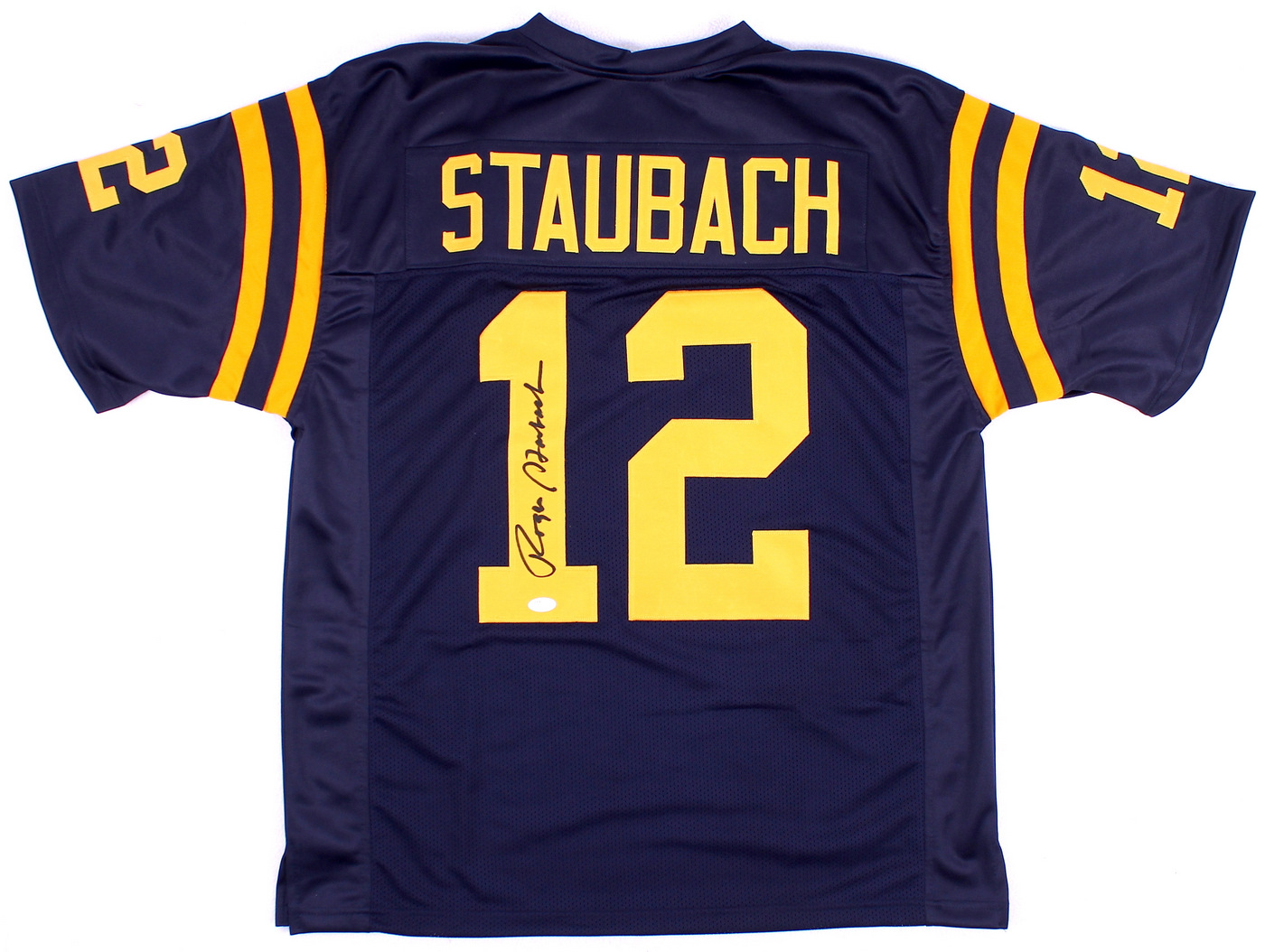 Custom on-field style jersey. Everything is sewn on, size XL. Hand-signed in black felt-tip pen by Roger Staubach (Cowboys HOF). The autograph includes an official James Spence Authentication (JSA) hologram and matching COA for authenticity purposes. The signing of this item was witnessed by JSA.