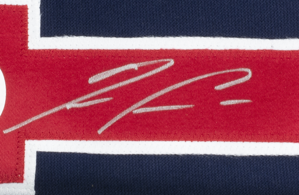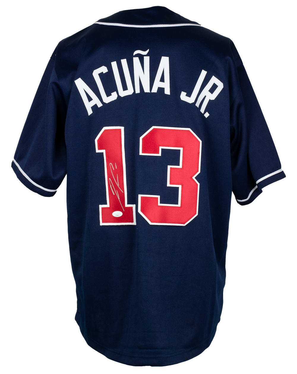 Custom on-field style jersey. Everything is sewn on, size XL. Has been hand-signed by Ronald Acuna Jr.