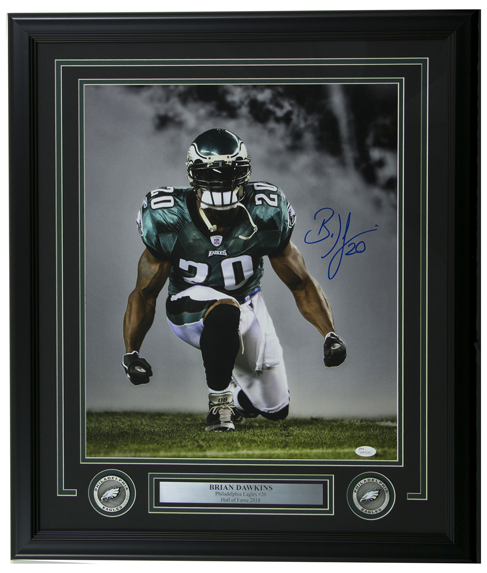 Custom frame measures approximately 22" x 27" in size and features a photo that has been hand-signed by Brian Dawkins (Philadelphia Eagles, HOF).