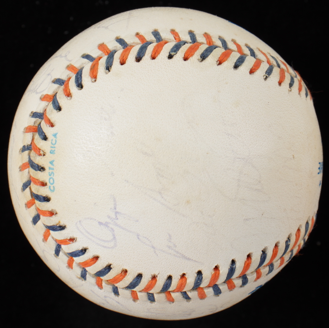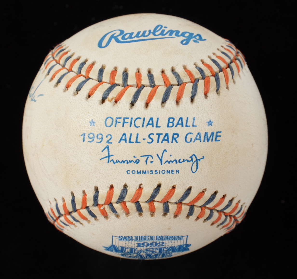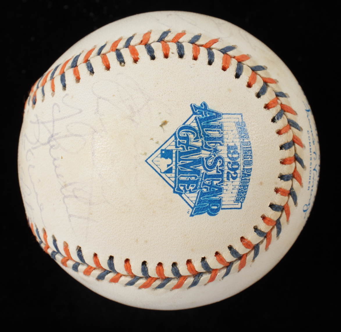 1992 All-Star Game Baseball. Hand-signed by (25) including Mike Schmidt, Tony Gwynn, Ozzie Smith, Craig Biggio, Darren Daulton, Terry Pendleton, Gary Sheffield, Fred McGriff, Larry Walker, Tom Glavine, Lee Smith, Joe Torre and (13) others. Includes the display case as shown. Please note, the baseball shows signs of natural toning.