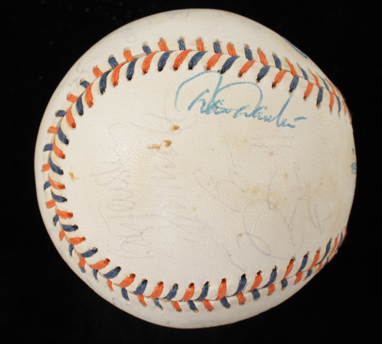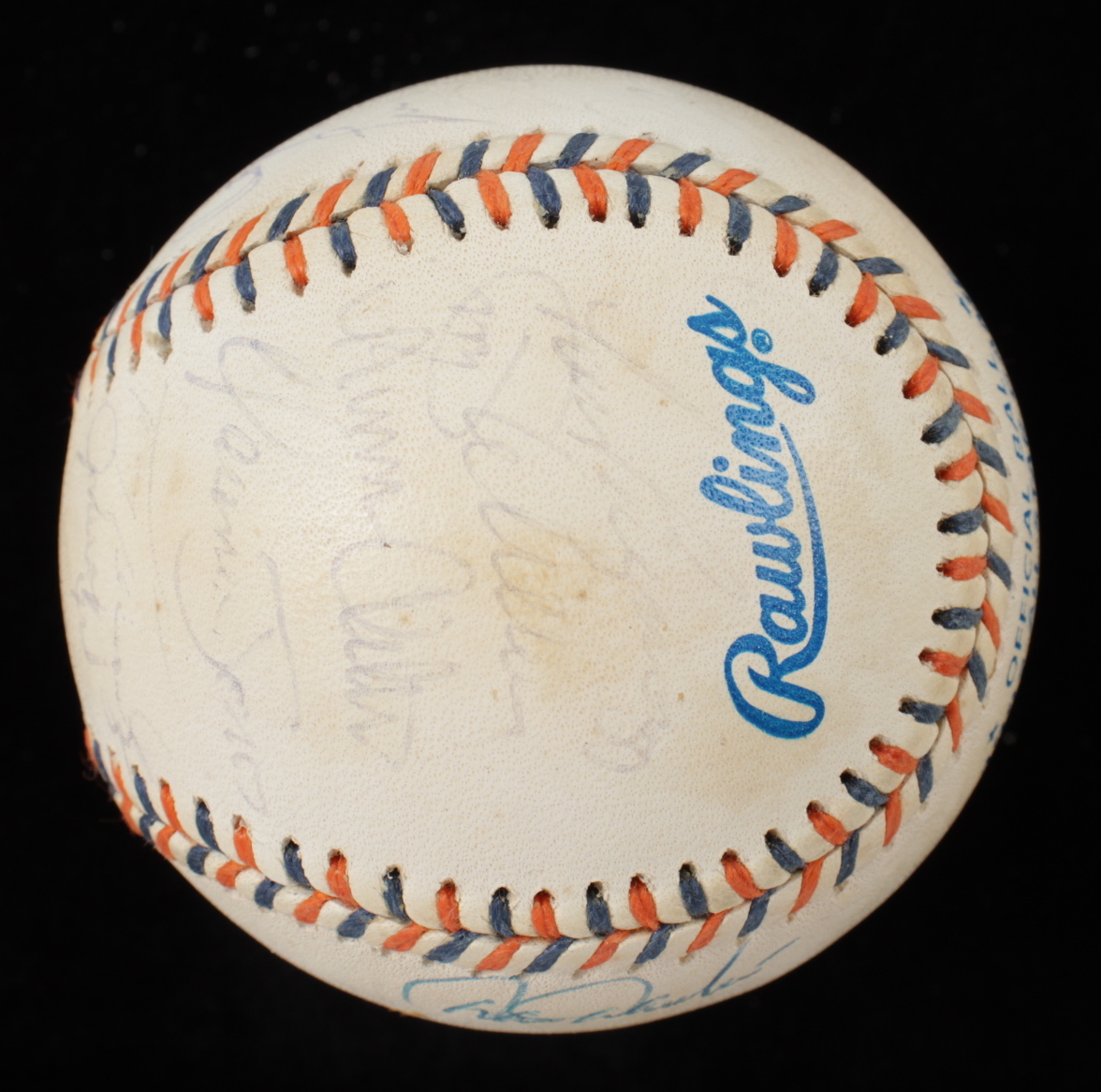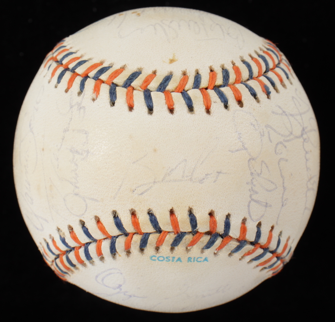 1992 All-Star Game Baseball. Hand-signed by (25) including Mike Schmidt, Tony Gwynn, Ozzie Smith, Craig Biggio, Darren Daulton, Terry Pendleton, Gary Sheffield, Fred McGriff, Larry Walker, Tom Glavine, Lee Smith, Joe Torre and (13) others. Includes the display case as shown. Please note, the baseball shows signs of natural toning.