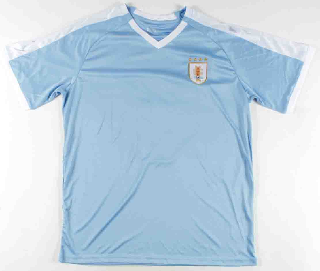 Custom on-field style jersey. Everything printed on, size XL. Hand-signed by Luis Suarez.