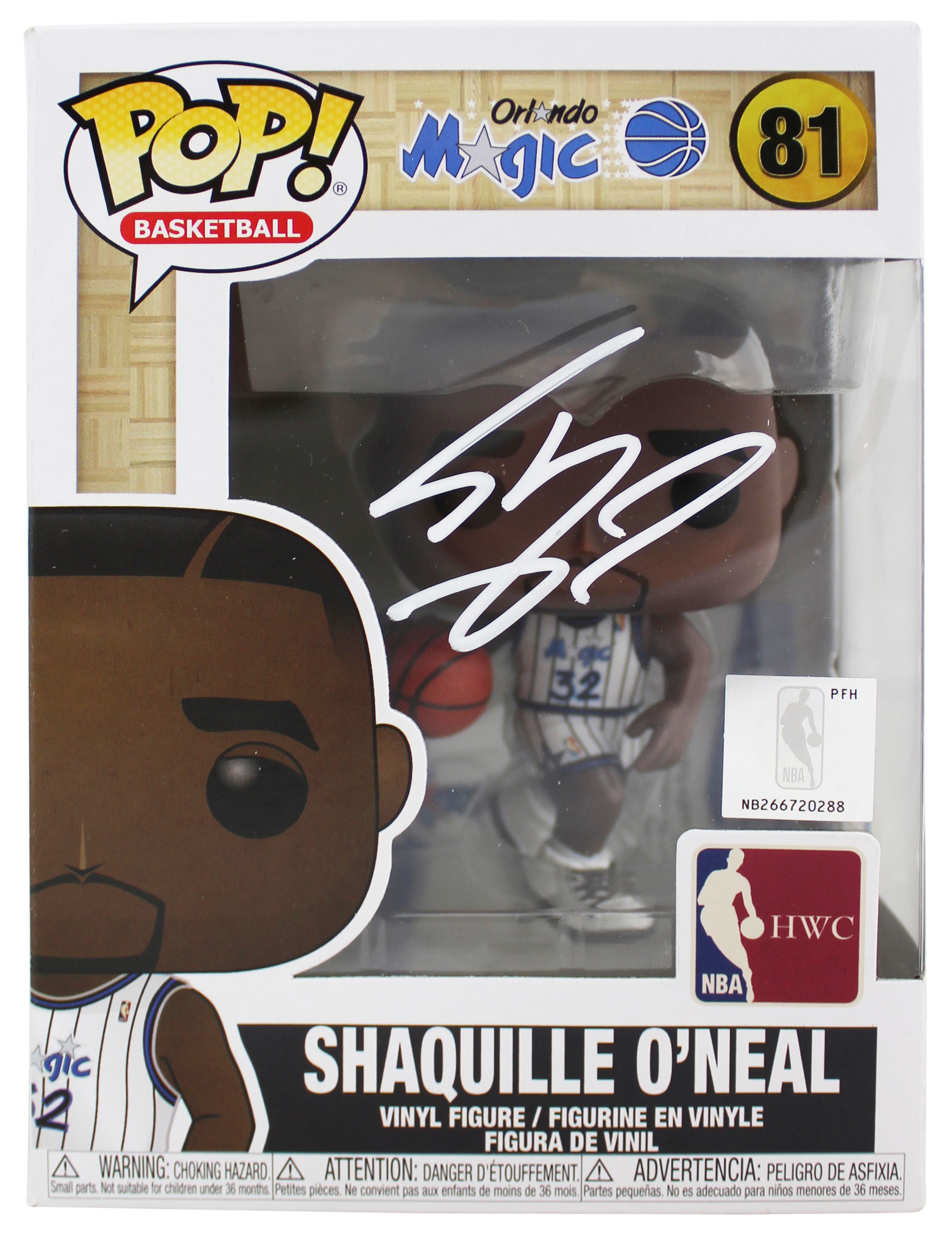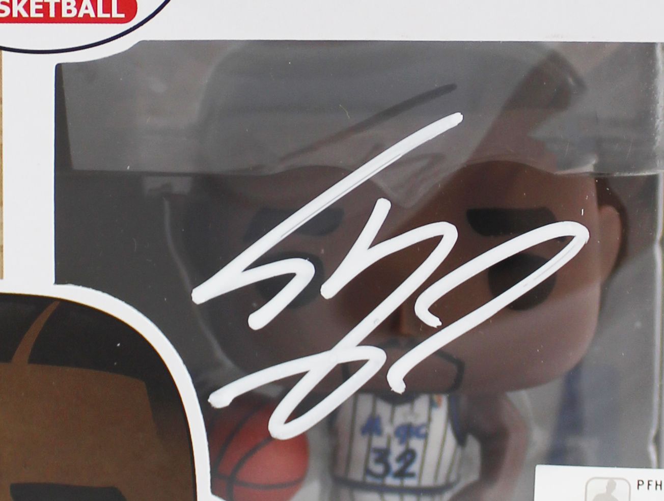The vinyl figure has been hand-signed on the original packaging by Shaquille O'Neal (Orlando Magic, HOF).