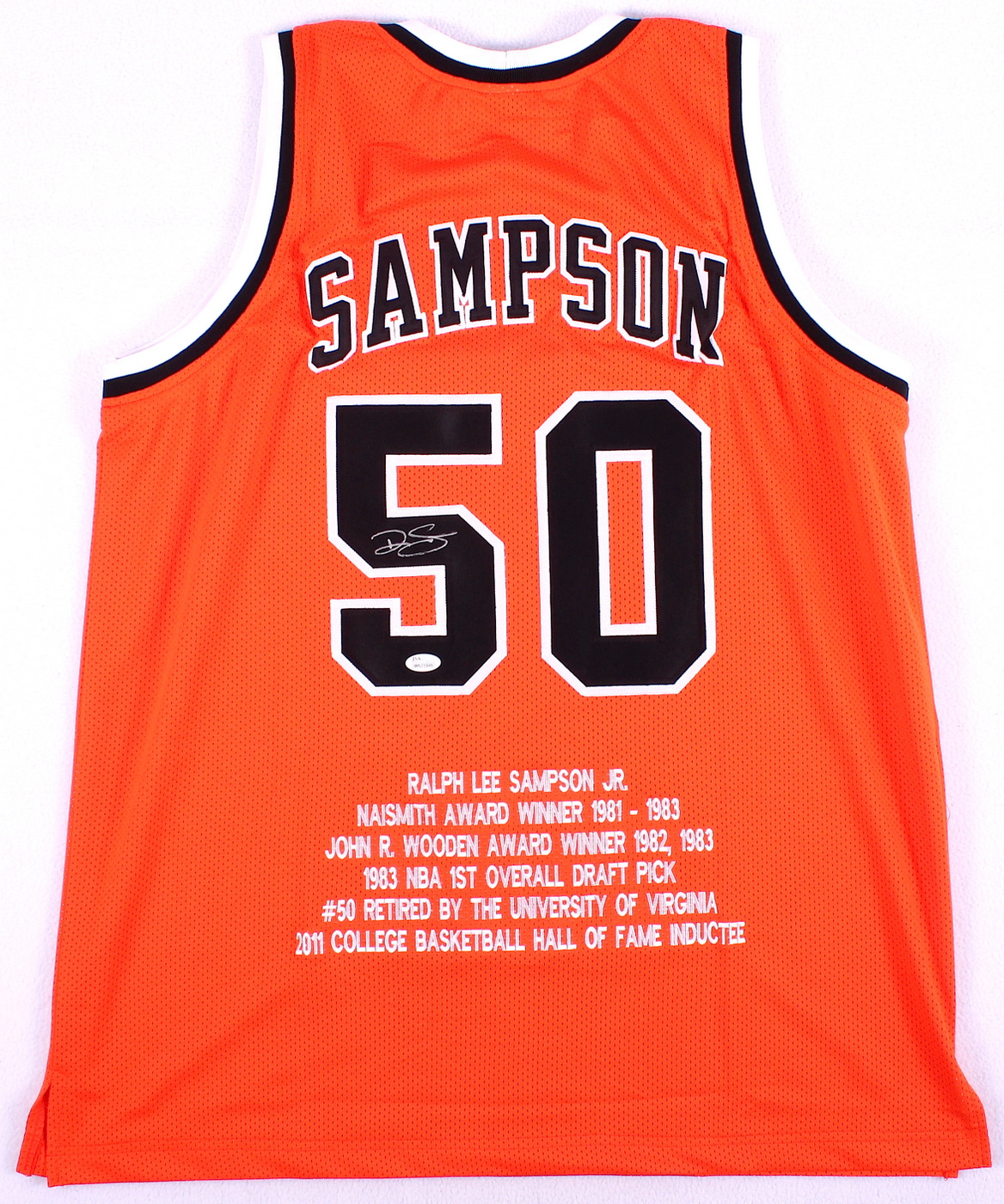 Custom on-court style jersey. Everything sewn on, size XL. Hand-signed in silver paint pen by Ralph Sampson (Rockets HOF). Sampson's career stats are custom stitched onto the jersey below the reverse numbers. The autograph includes an official James Spence Authentication (JSA) hologram and matching COA for authenticity purposes. The signing of this item was witnessed by JSA.