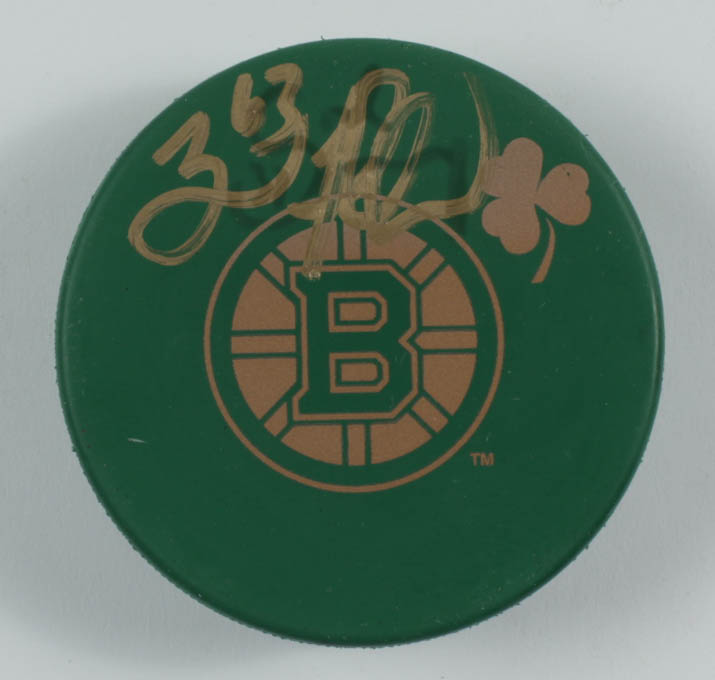 Boston Bruins logo green shamrock hockey puck has been hand-signed by Brad Marchand.