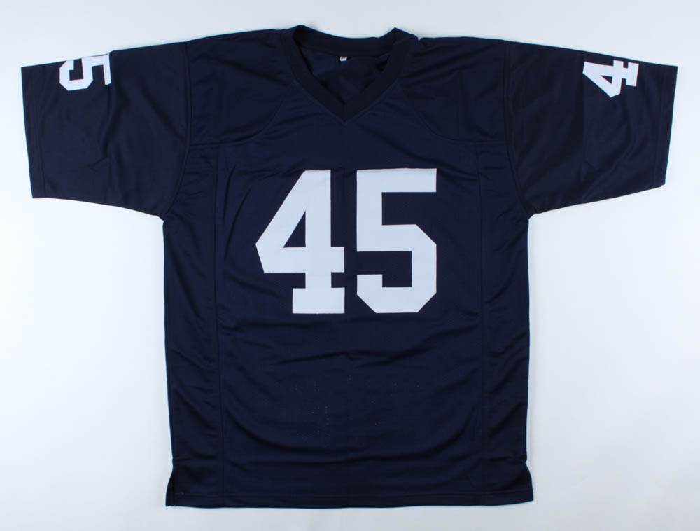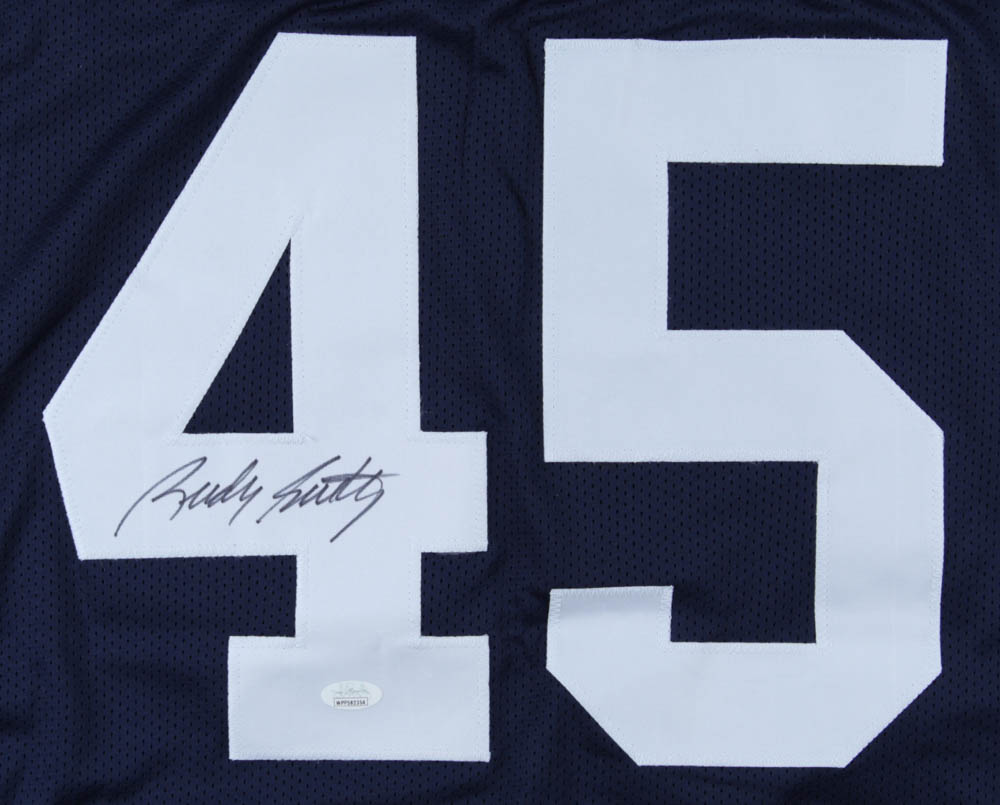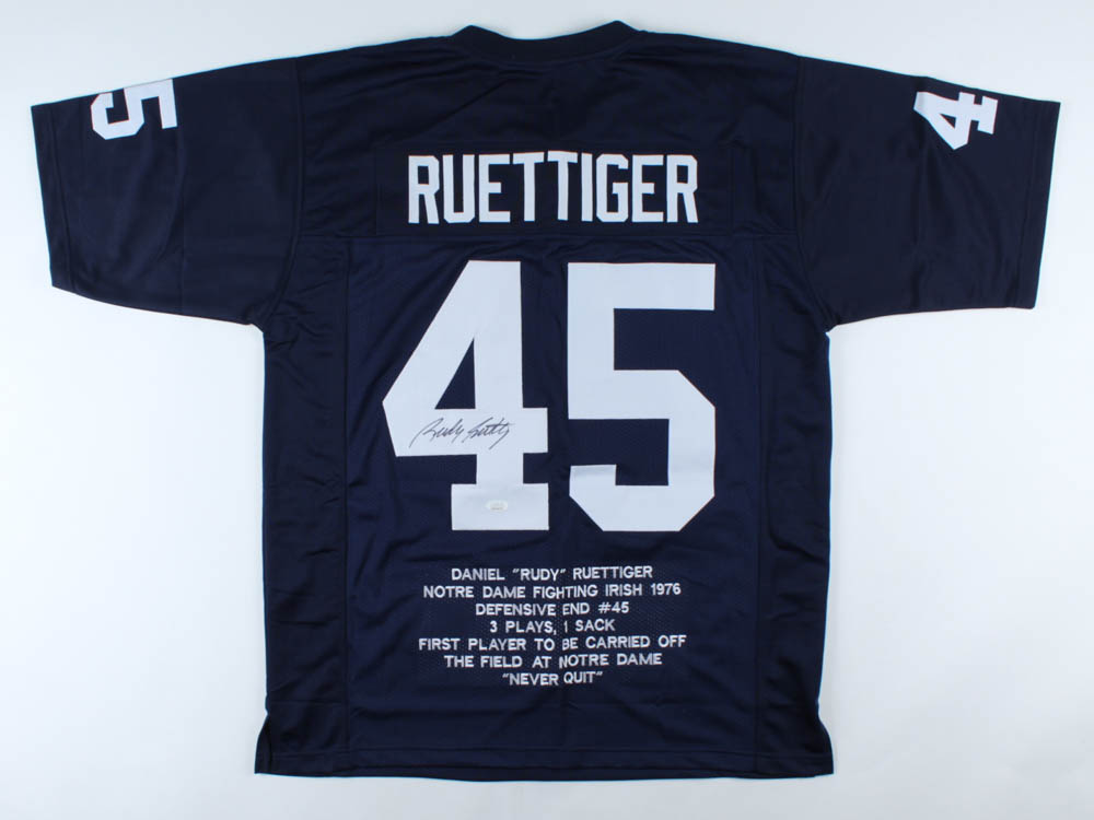 Custom on-field style jersey. Everything is sewn on, size XL. Hand-signed by Rudy Ruettiger. Ruettiger's career highlights have been custom stitched onto the back of the jersey below the reverse numbers.