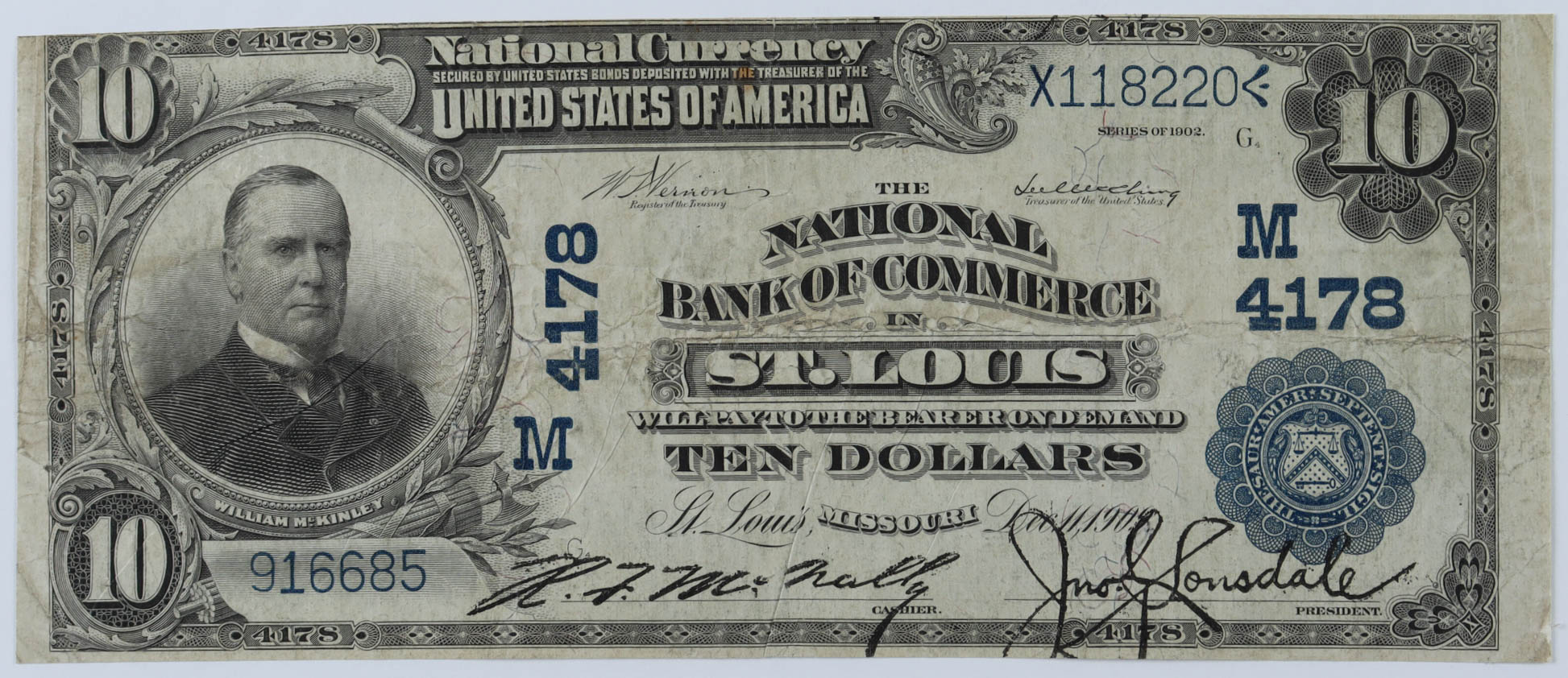 1902 $10 Ten-Dollar U.S. National Currency Large-Size Bank Note - The National Bank of Commerce in St. Louis, Missouri