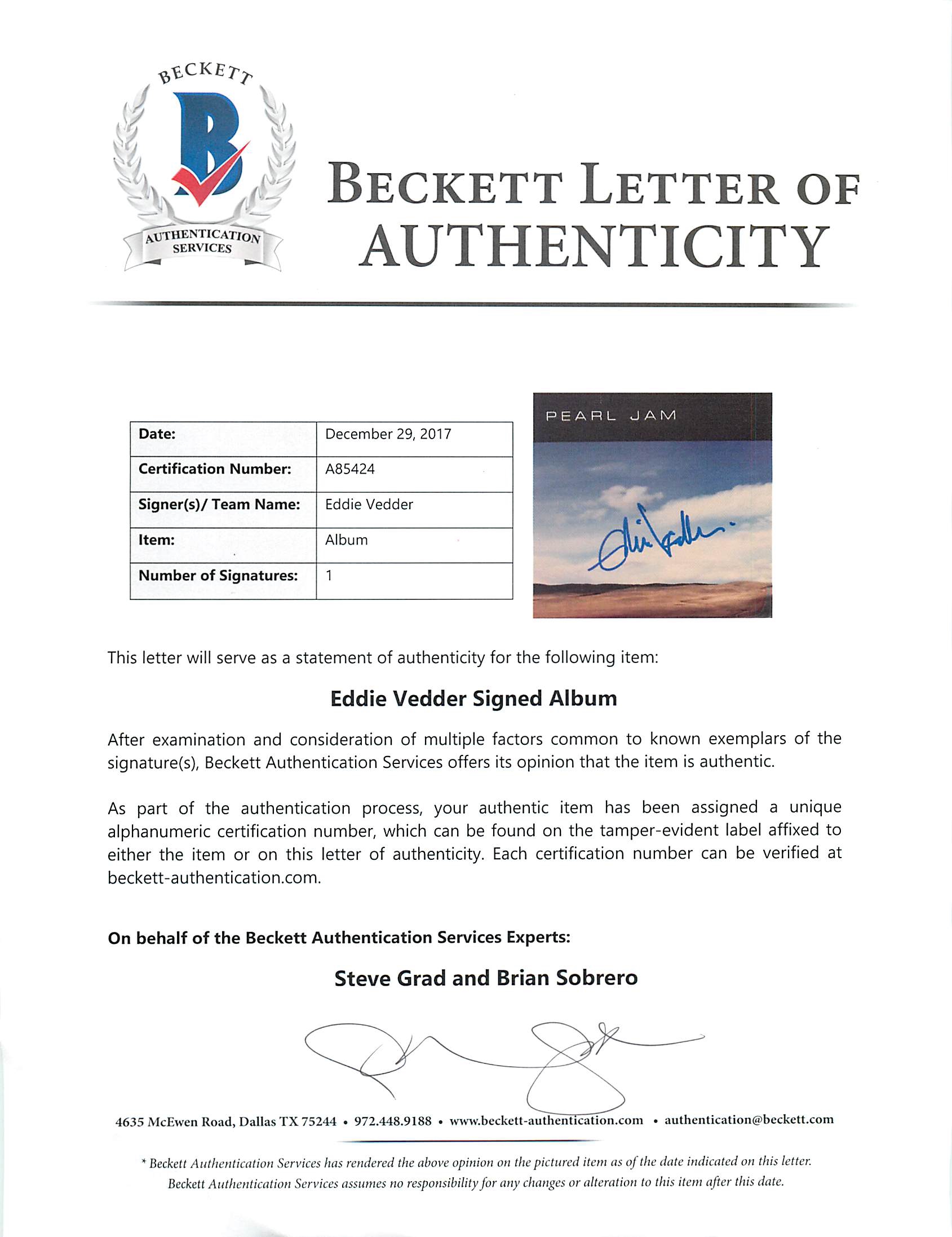 Eddie Vedder Signed Pearl Jam "Yield" Vinyl Record Album (Beckett LOA)
