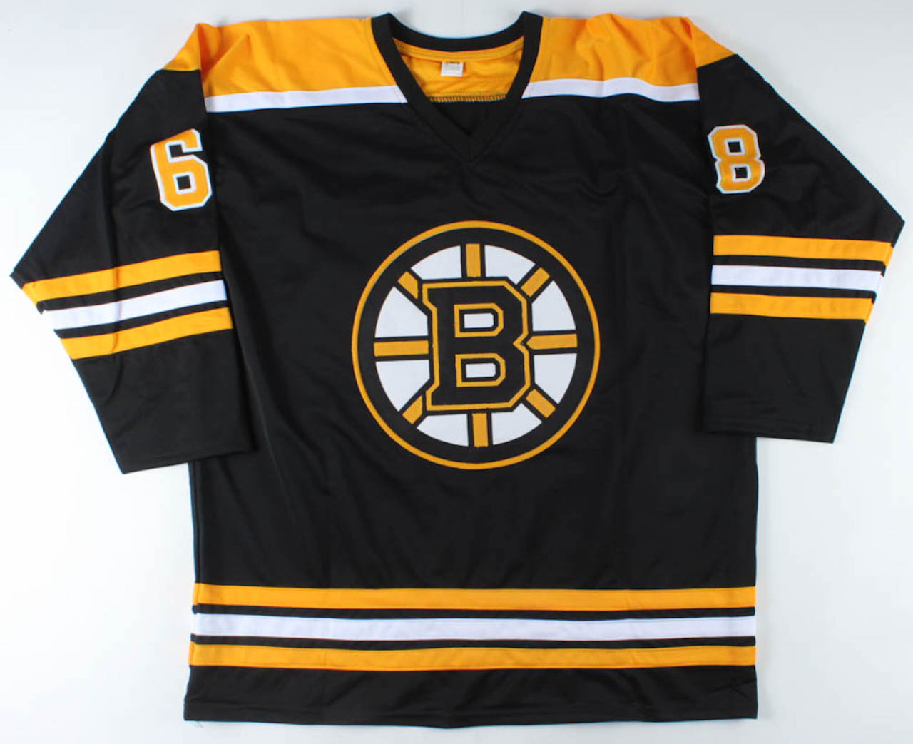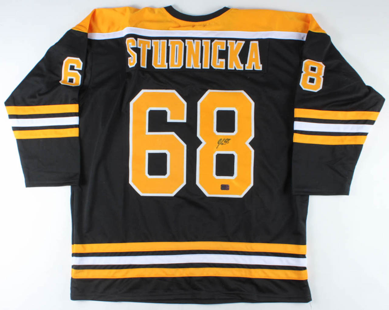 Custom on-ice style jersey. Everything is sewn on, size XL. Hand-signed by Jack Studnicka. Please note, signature shows minor signs of bleeding and the back numbers have a slight color disparity.