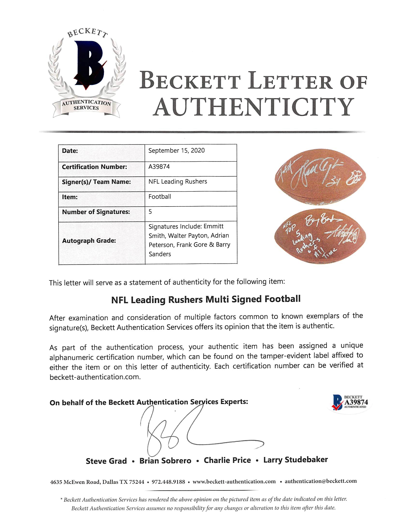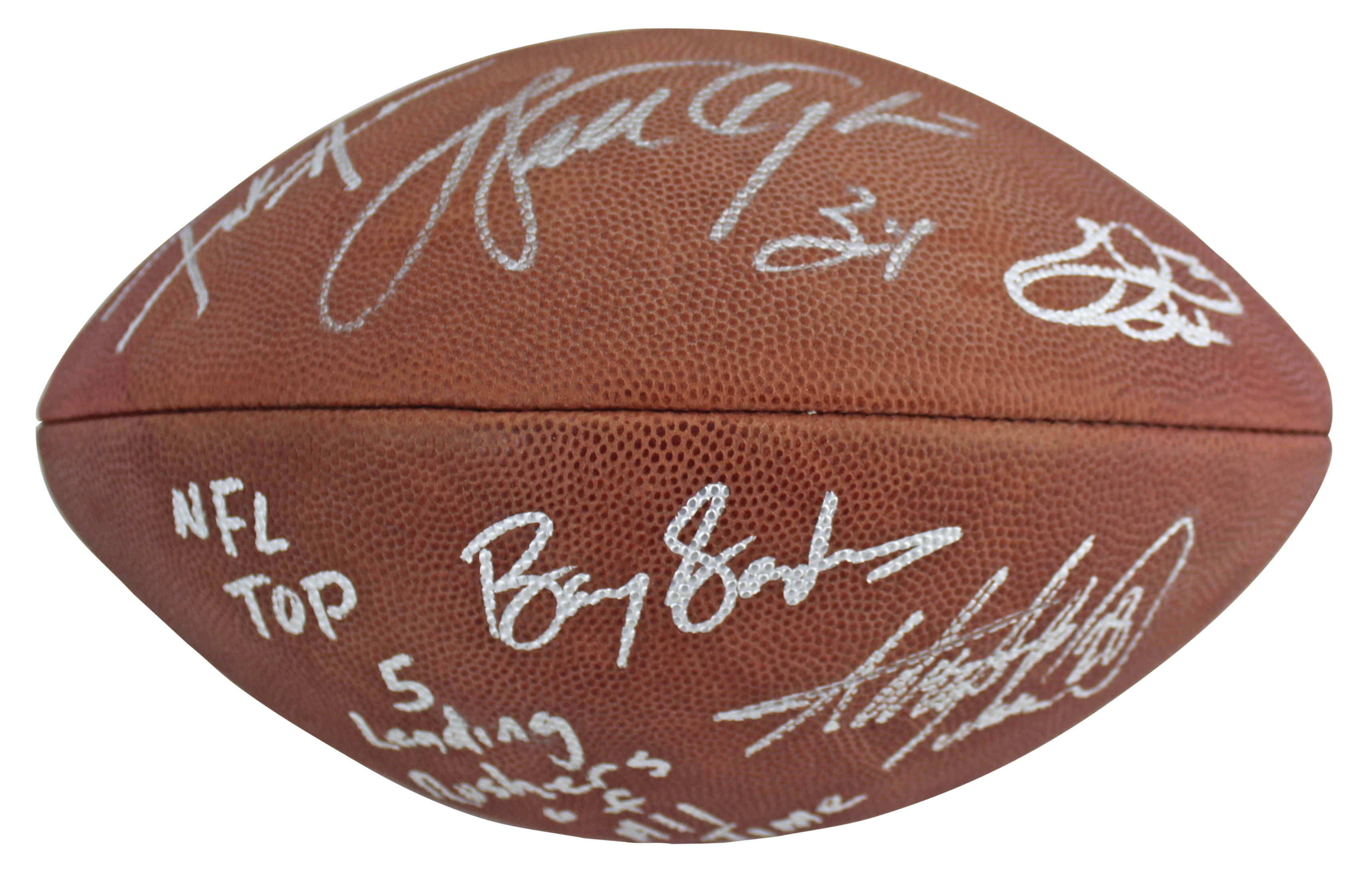 Official NFL Football Signed by (5) with Walter Payton, Emmitt Smith, Barry Sanders, Frank Gore & Adrian Peterson Inscribed "NFL Top 5 Leading Rushers Of All Time" (Beckett LOA)