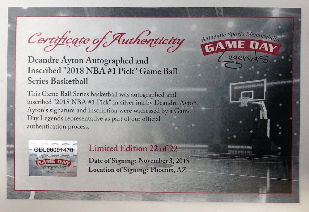 This basketball was autographed by Deandre Ayton with the inscription "2018 NBA #1 Pick." It is officially licensed by the National Basketball Association and comes with an individually numbered, tamper-evident hologram from Game Day Legends Authenticated as well as Steiner Sports Authentic.Your signed item can be identified and verified for authenticity by entering the serial number from your hologram into our online database. This process confirms and guarantees that your collectible is authentic and eliminates all possibility of duplication and fraud. This product is guaranteed authentic and includes a Game Day Legends Certificate of Authenticity and an accompanying tamper-evident hologram. Personally Autographed by Deandre Ayton. You will receive number "22" from the edition. Video of signing available online. Officially licensed by the National Basketball Association.