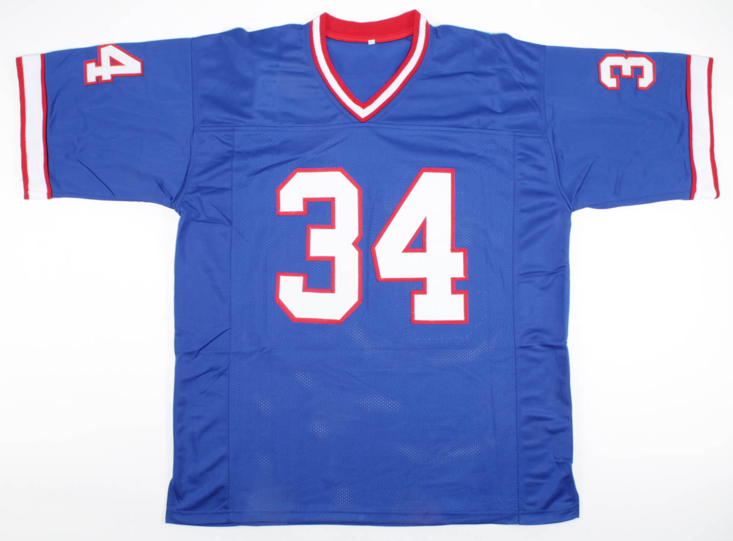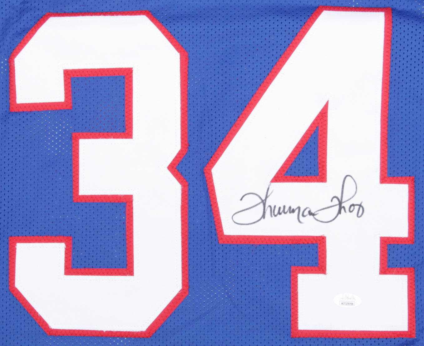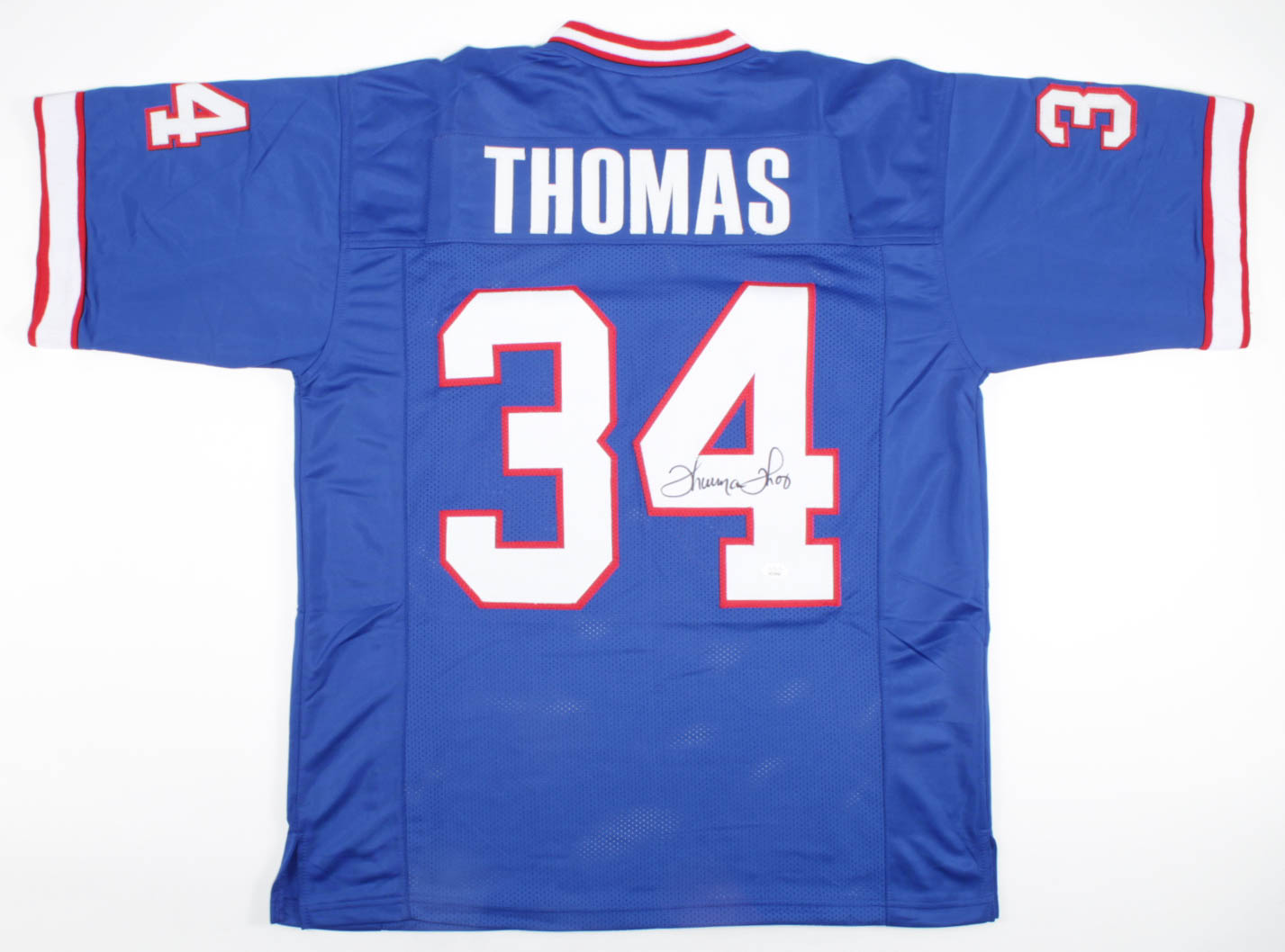 Custom on-field style jersey. Everything is sewn on, size XL. Has been hand-signed by Thurman Thomas (HOF).