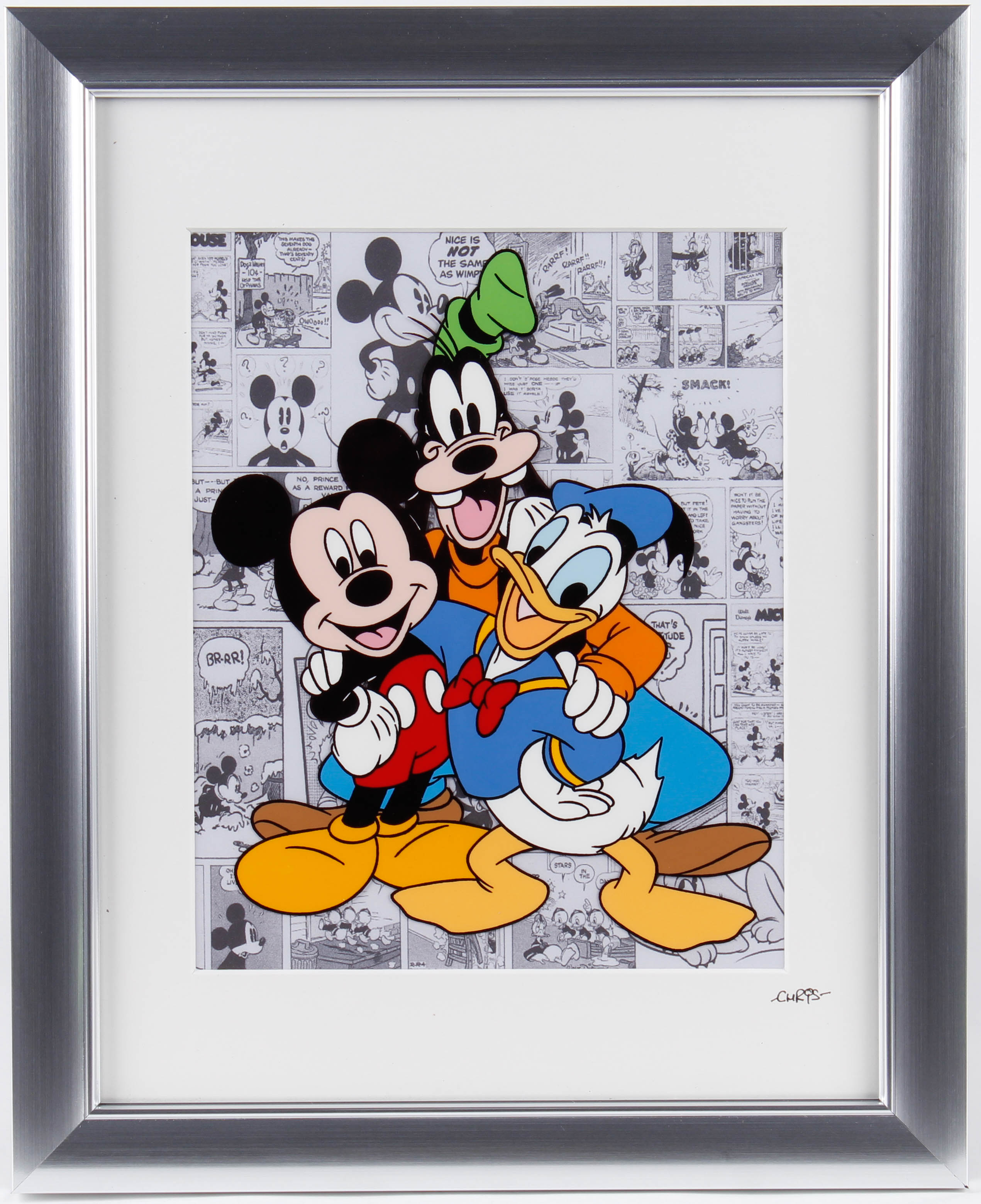 Custom frame measures 13" x 16" in size and features a hand-painted serigraph cel of Walt Disney's characters including: Mickey Mouse, Goofy, Donald Duck, and Pluto.