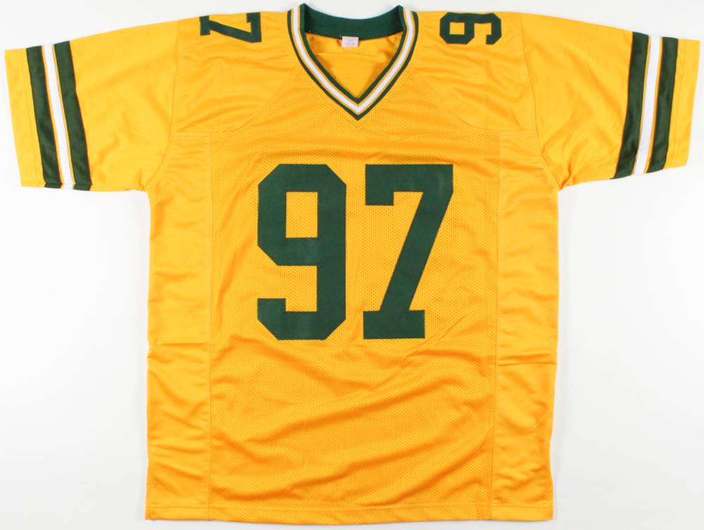 Custom on-field style jersey. Everything sewn on, size XL. Hand-signed by Kenny Clark.