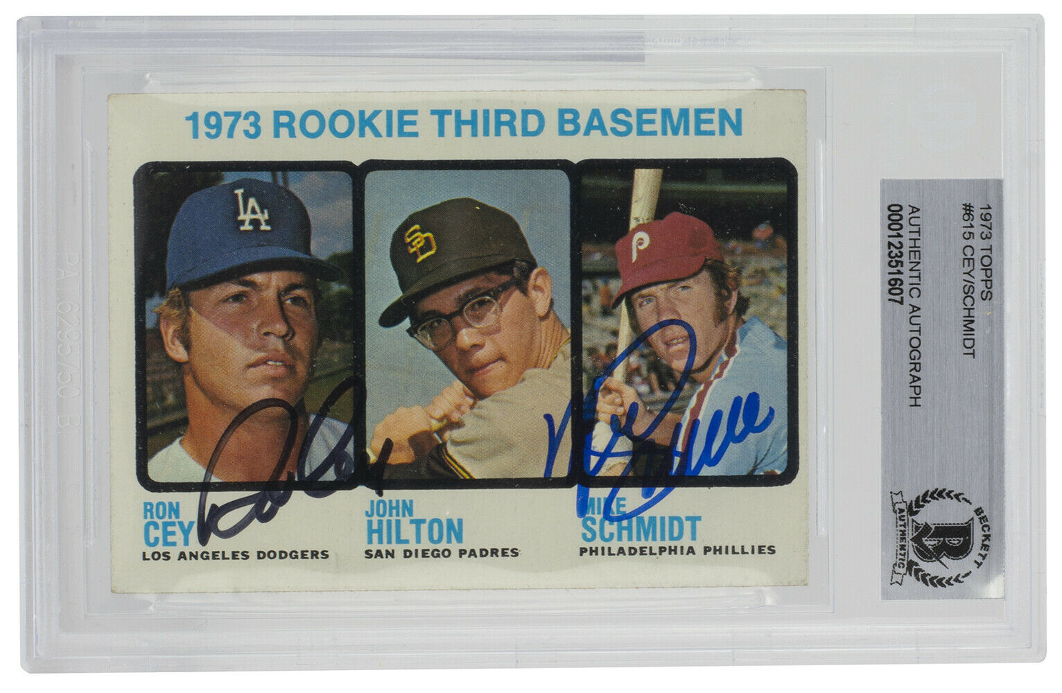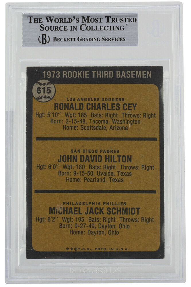Mike Schmidt & Ron Cey Signed 1973 Topps #615 Rookie Third Basemen / Ron Cey / John Hilton RC / Mike Schmidt RC (BGS Encapsulated)