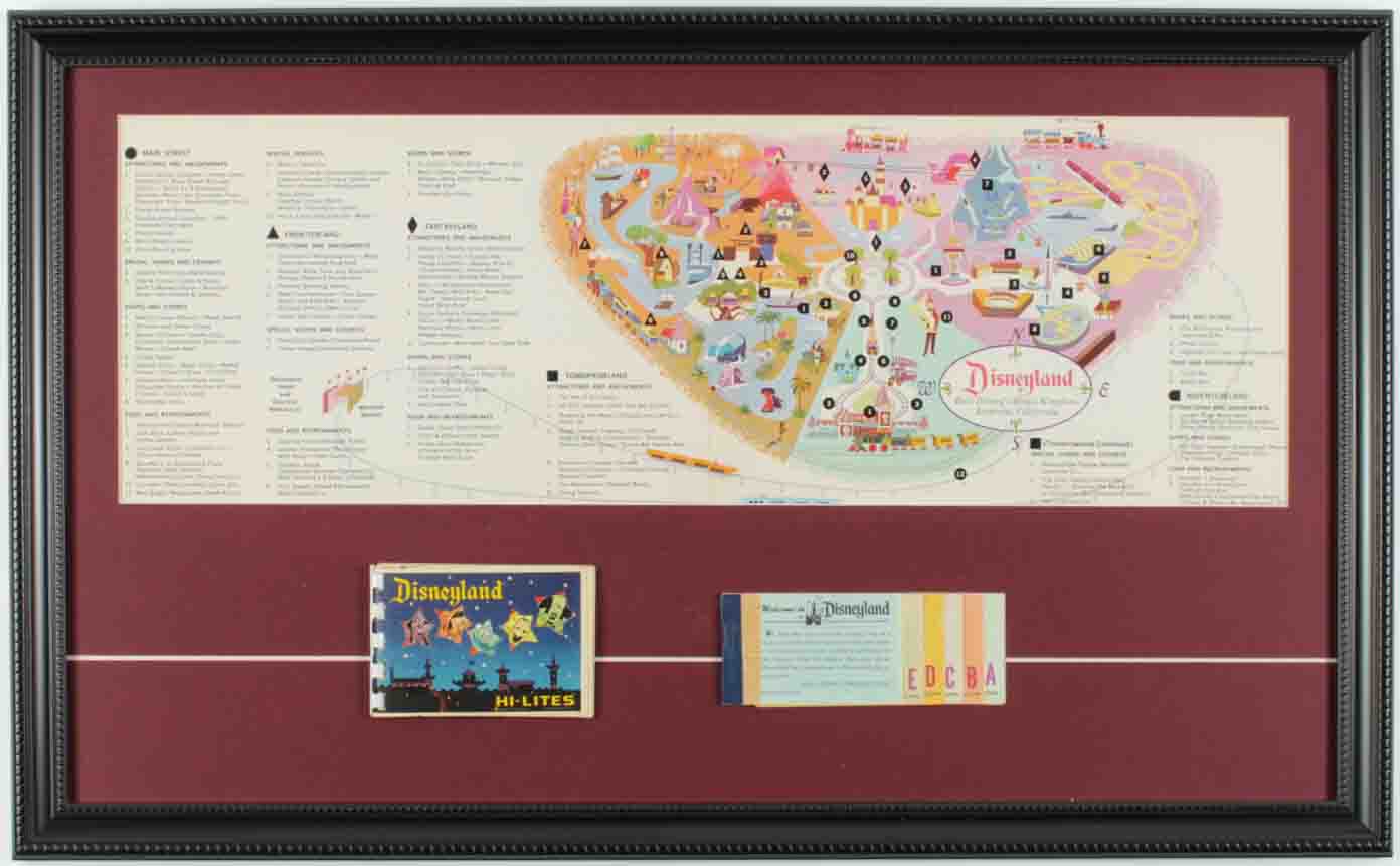 Disneyland 16x26 Custom Framed Vintage 1963 Magic Kingdom Map Display with Vintage Disneyland Ticket Book & Photo Booklet