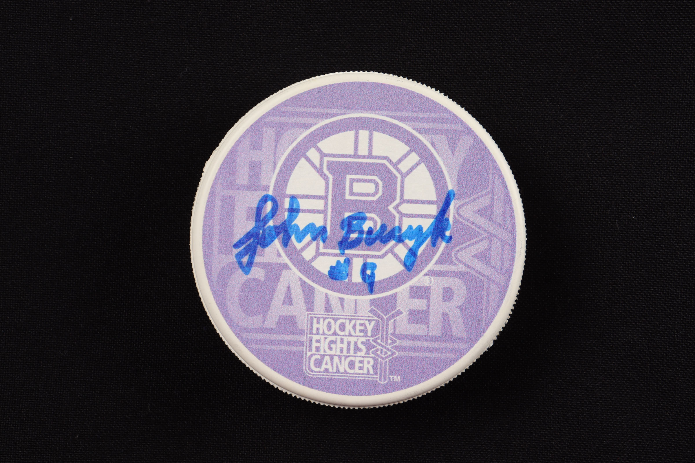 Boston Bruins Hockey Fights Cancer" Logo hockey puck. Hand-signed and inscribed by Johnny Bucyk (HOF).