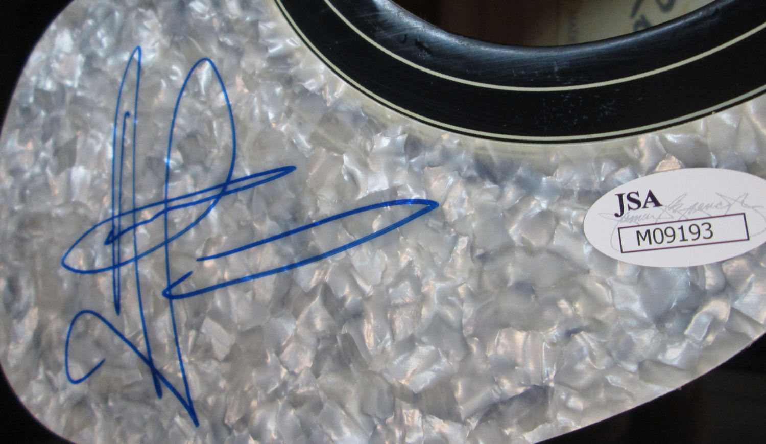 Black DeRosa acoustic guitar. Hand-signed on a perloid pickguard in blue felt-tip pen by Aaron Lewis.