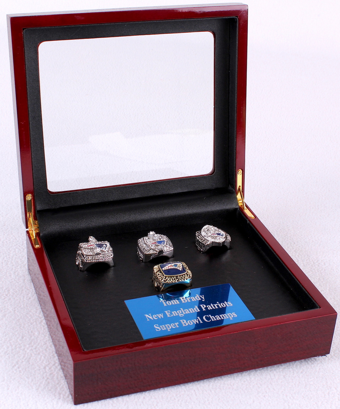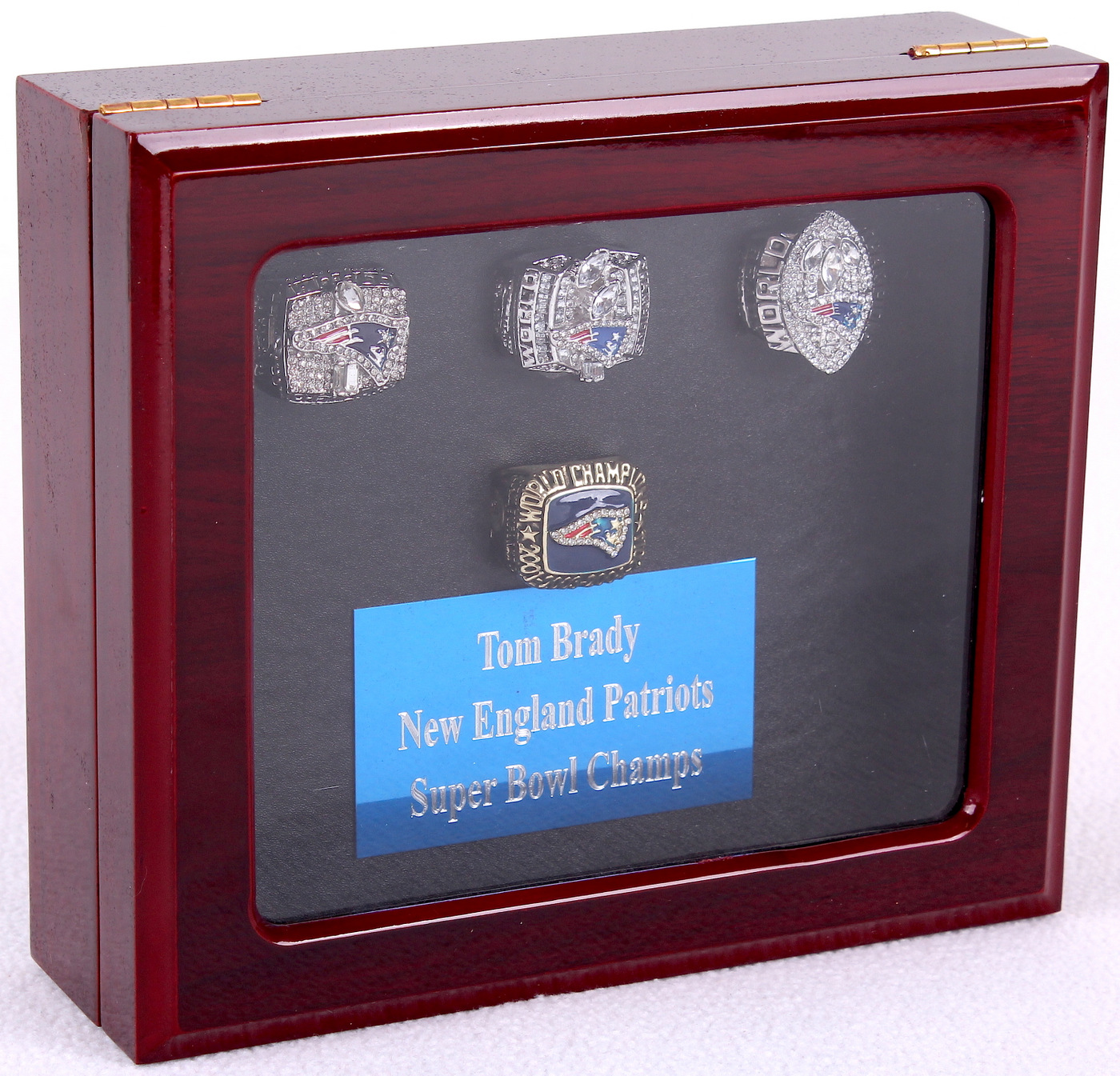 Set of (4) Tom Brady Patriots Championship Rings with High Quality Cherry Wood Custom Display Box & Engraved Nameplate