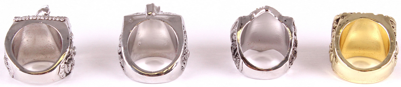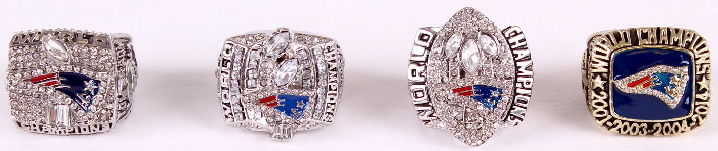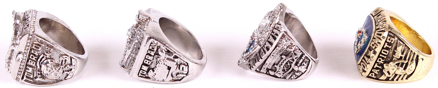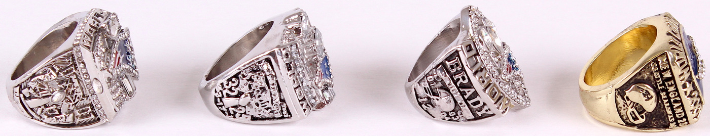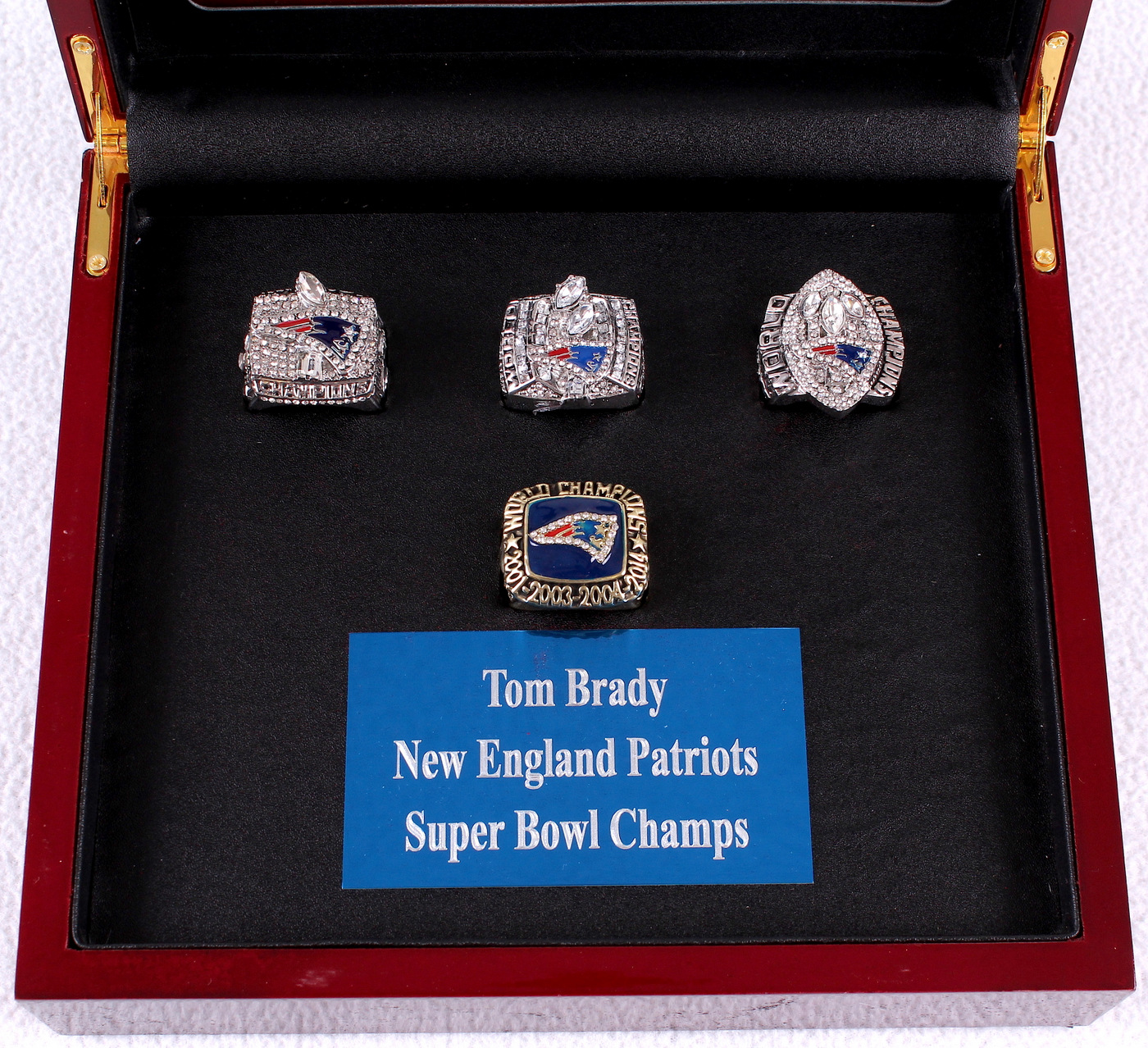 Set of (4) New England Patriots replica Tom Brady 2001, 2003, 2004, and 2014 Championship rings with display box. Wooden display box measures 8" x 7" x 2.5". The rings have been hand crafted by professional jewelers. Made with 18k gold plated over zinc alloy with high grade Cubic Zirconia (CZ) stones that have been all set by hand. Size 11. Nameplate not hand-signed.