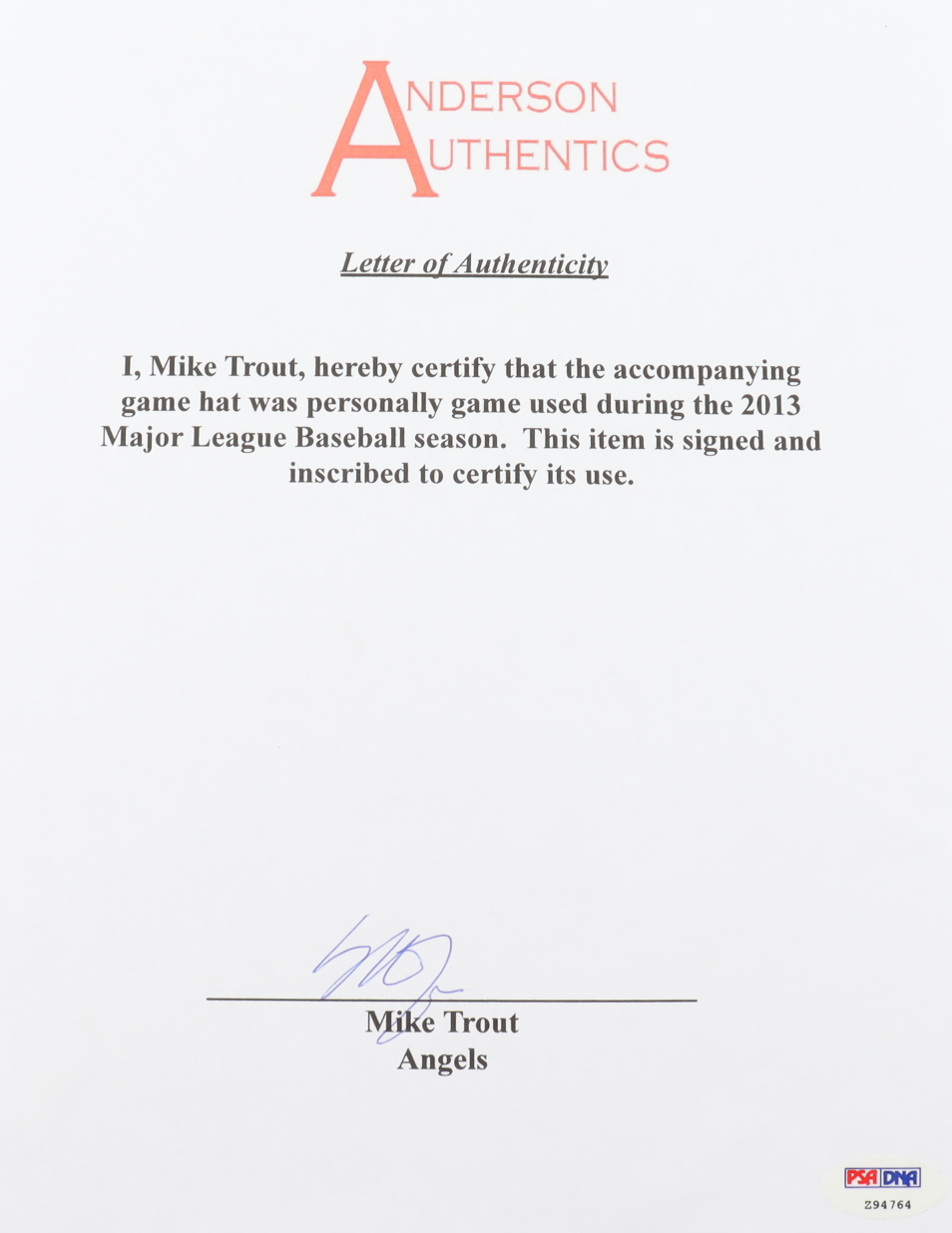 New Era Los Angeles Angels fitted hat size 7 1/2. It was Game-Used throughout the 2013 Major League Baseball season. Has been hand-signed by Mike Trout. Please note, the LOA is also signed by Trout and authenticated.