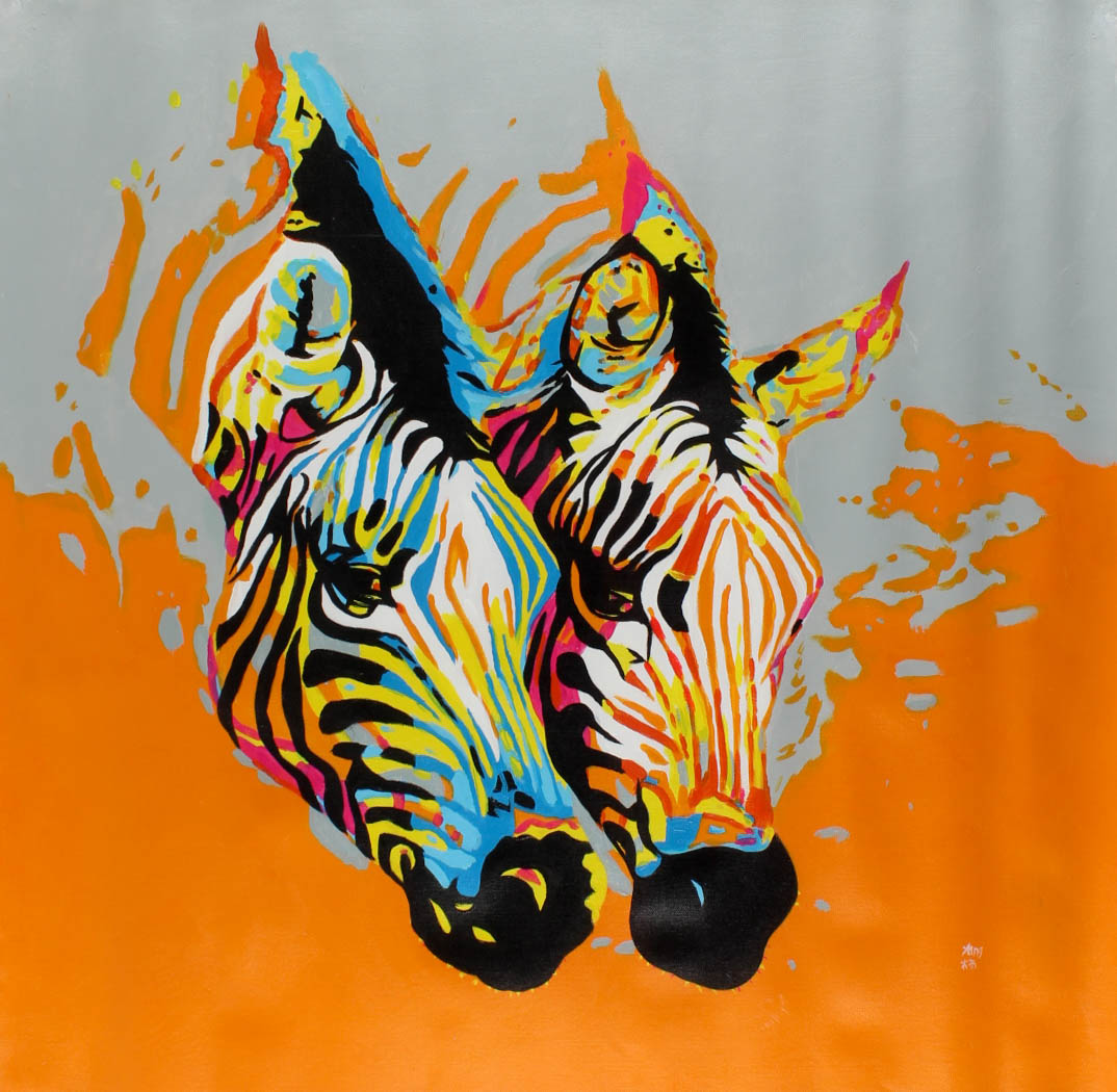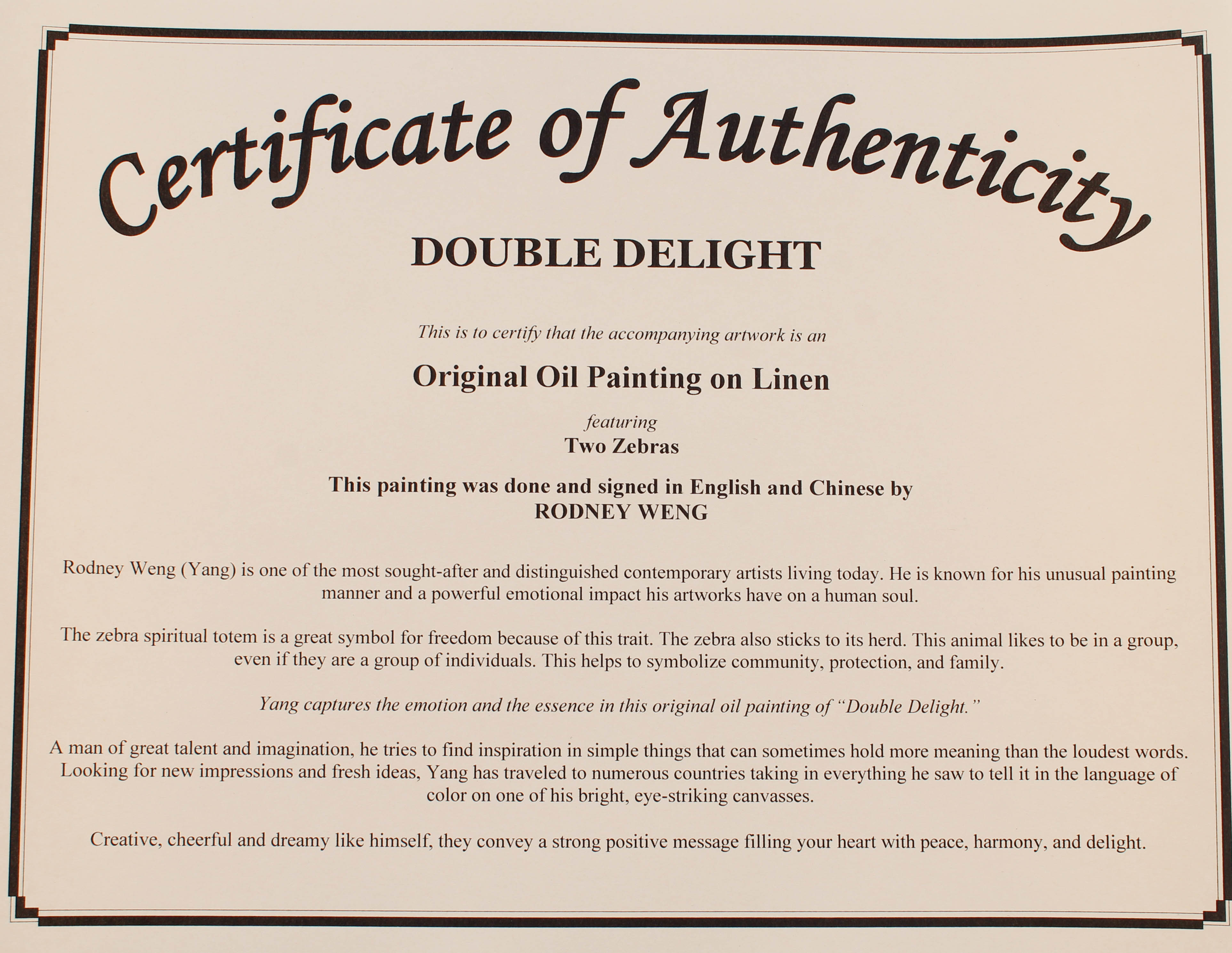 Very colorful painting of two Zebras. Original oil painting on linen uniquely hand-signed by Rodney Weng (Yang) both in Chinese and English.