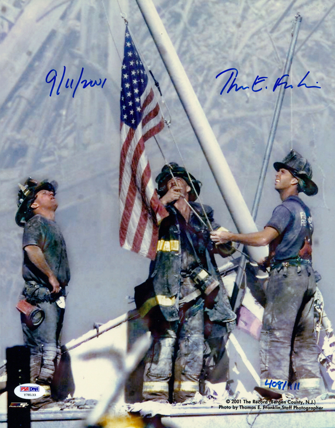 Photo measures 11" x 14" in size and has been hand-signed and inscribed in blue felt-tip pen by photographer Thomas E. Franklin. The photo is limited edition and hand-numbered #408/911. Piece includes an official PSA/DNA Hologram and matching COA for authenticity purposes.