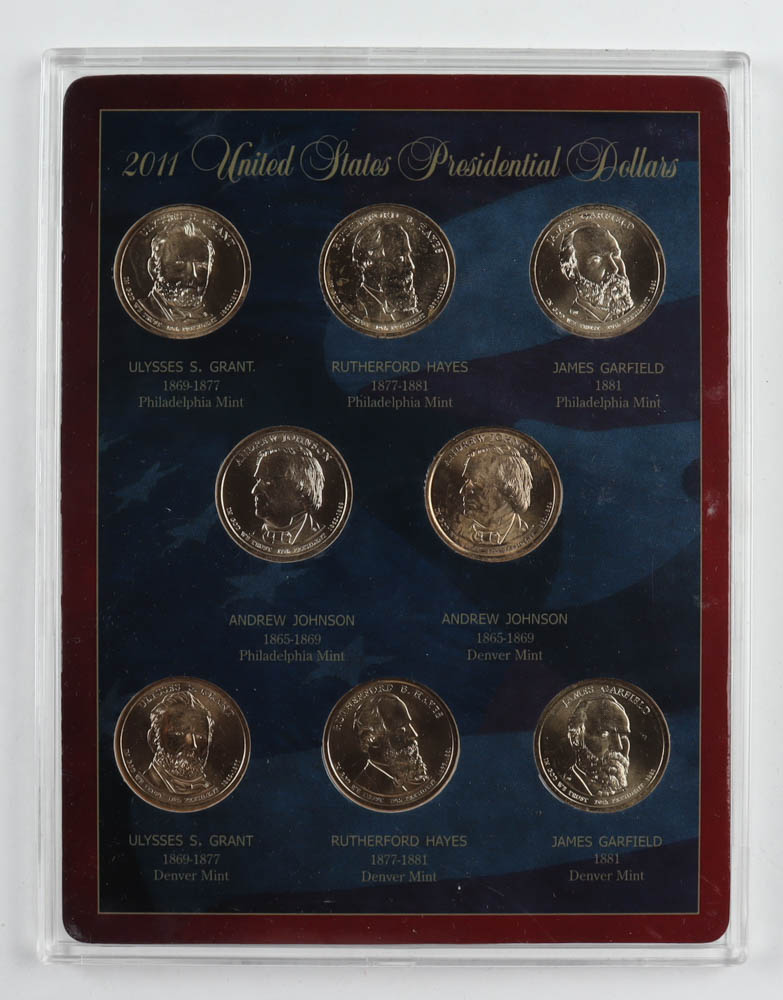 This set includes the 2011 Presidential Dollars in uncirculated condition from the Philadelphia and Denver Mints, the proof edition from San Francisco, as well as the Satin Finish Philadelphia and Denver Mint coins.