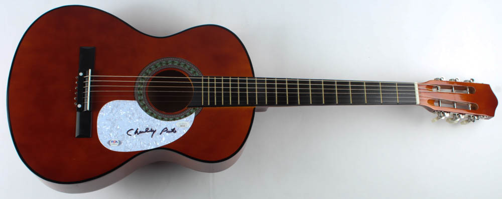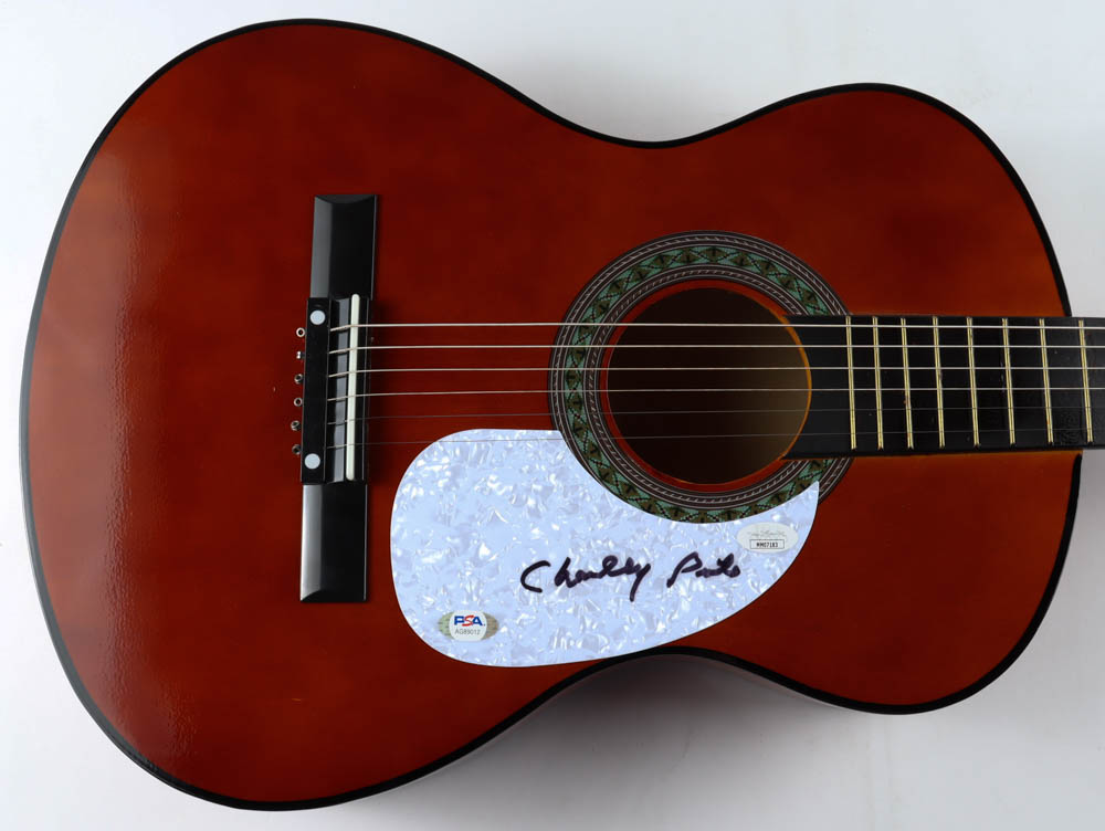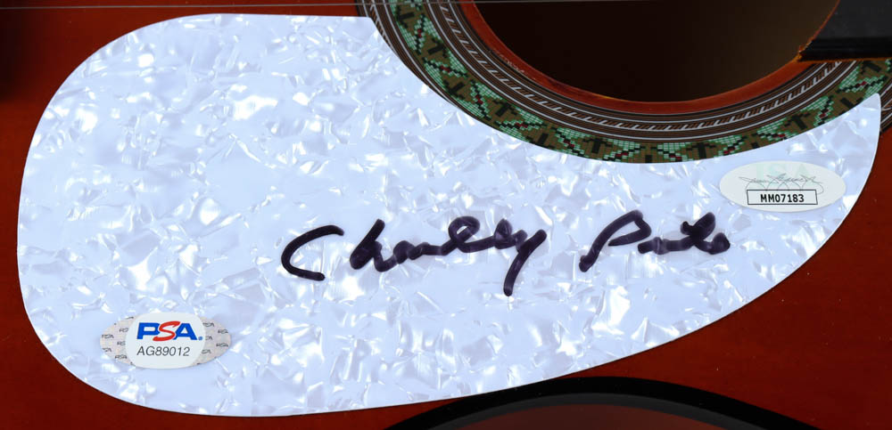 Acoustic guitar measures approximately 38" in length and has been hand-signed by Charley Pride. This guitar is a display guitar. It is a lower-tier version and is not the same quality as one that a musician would play.
