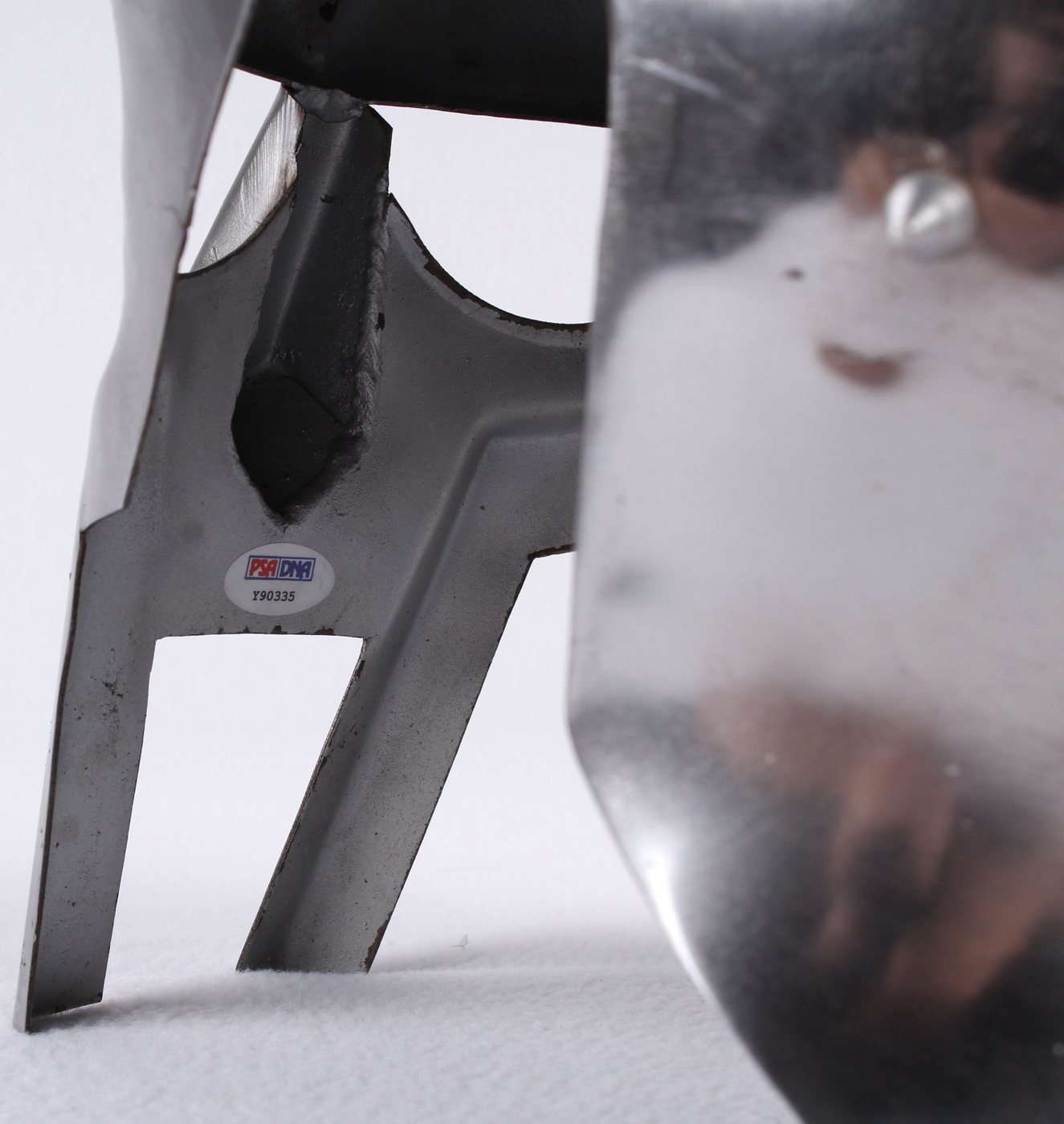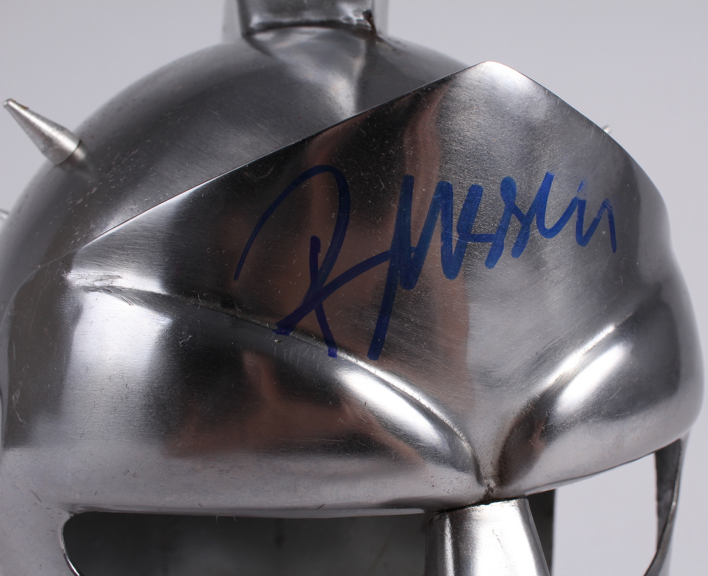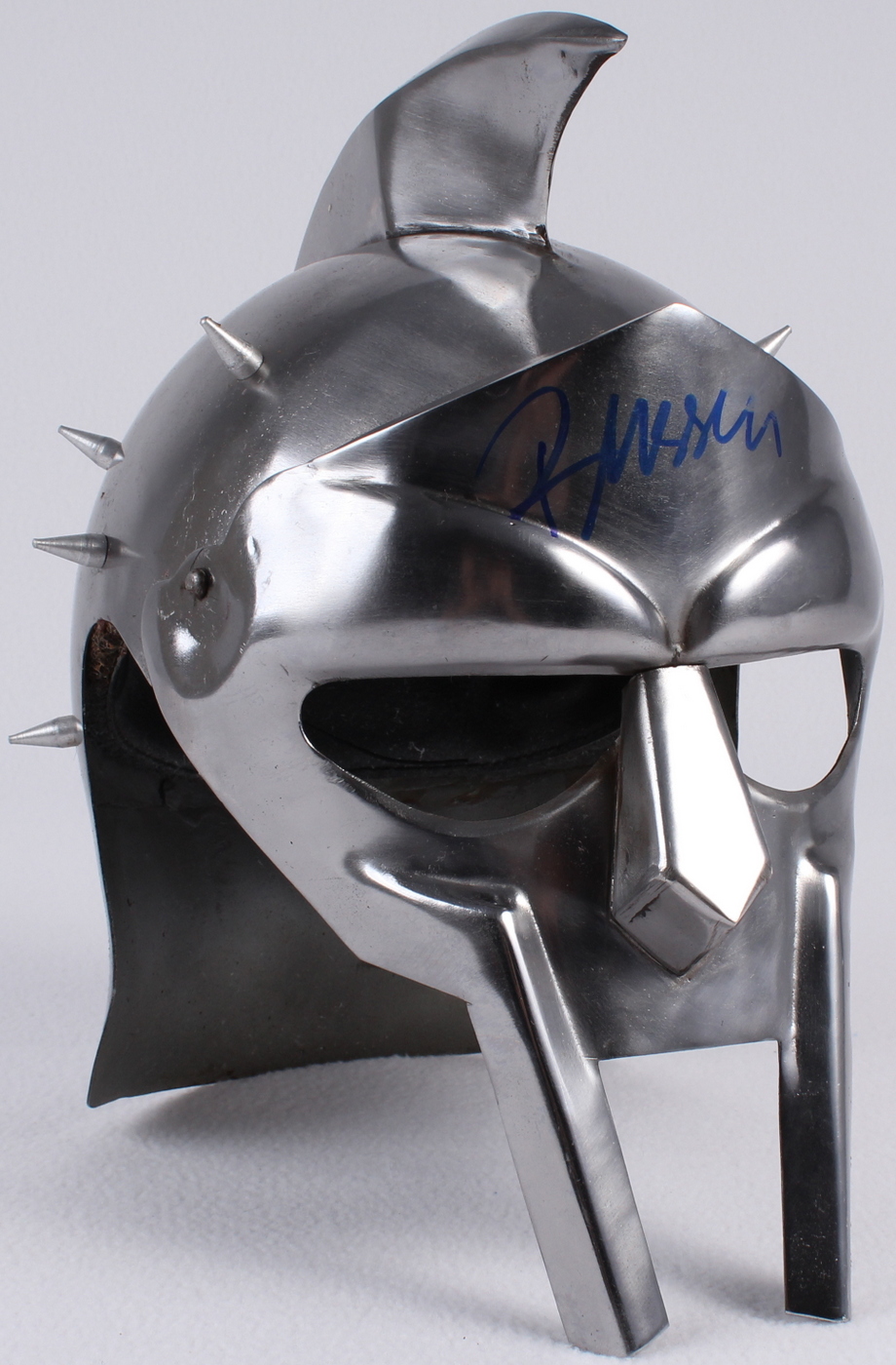 Full-size movie prop replica helmet is made of steel and hand-signed in blue felt tip pen by Russell Crowe. The helmet is approximately 13" in height. The autograph includes an official PSA/DNA hologram and matching COA for authenticity purposes.