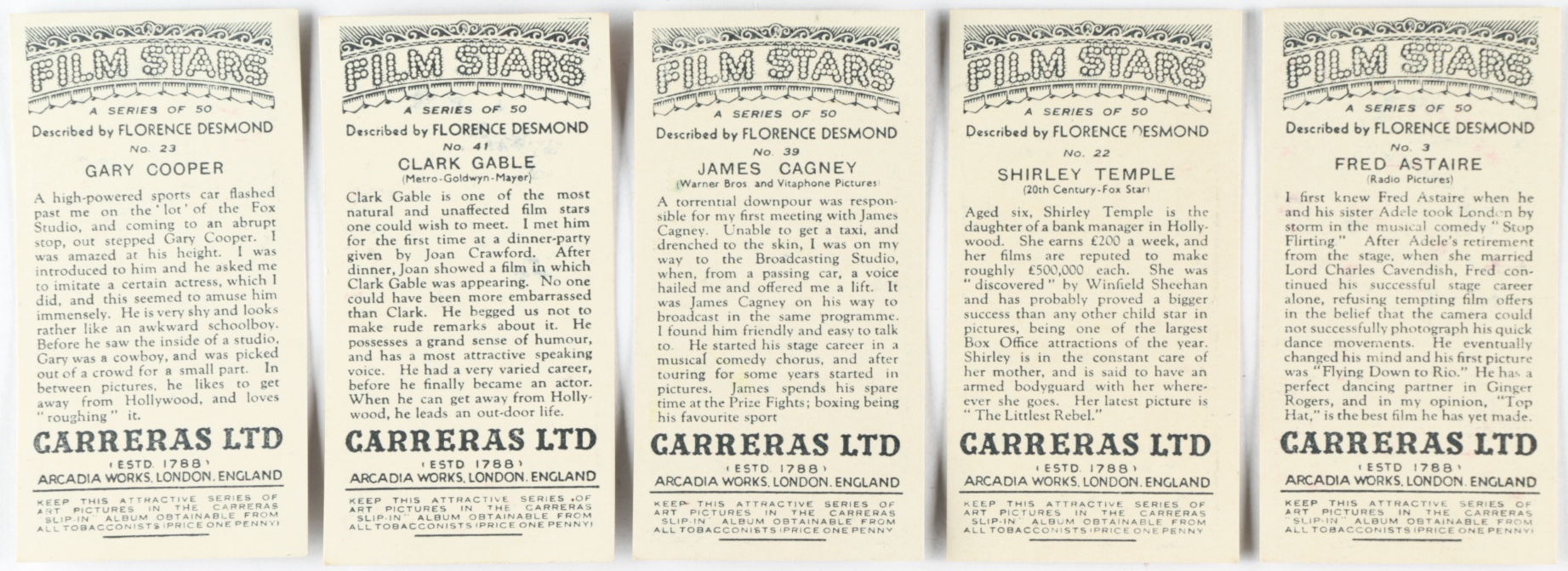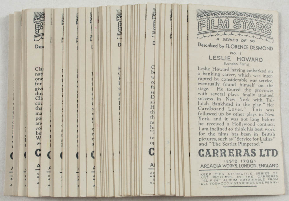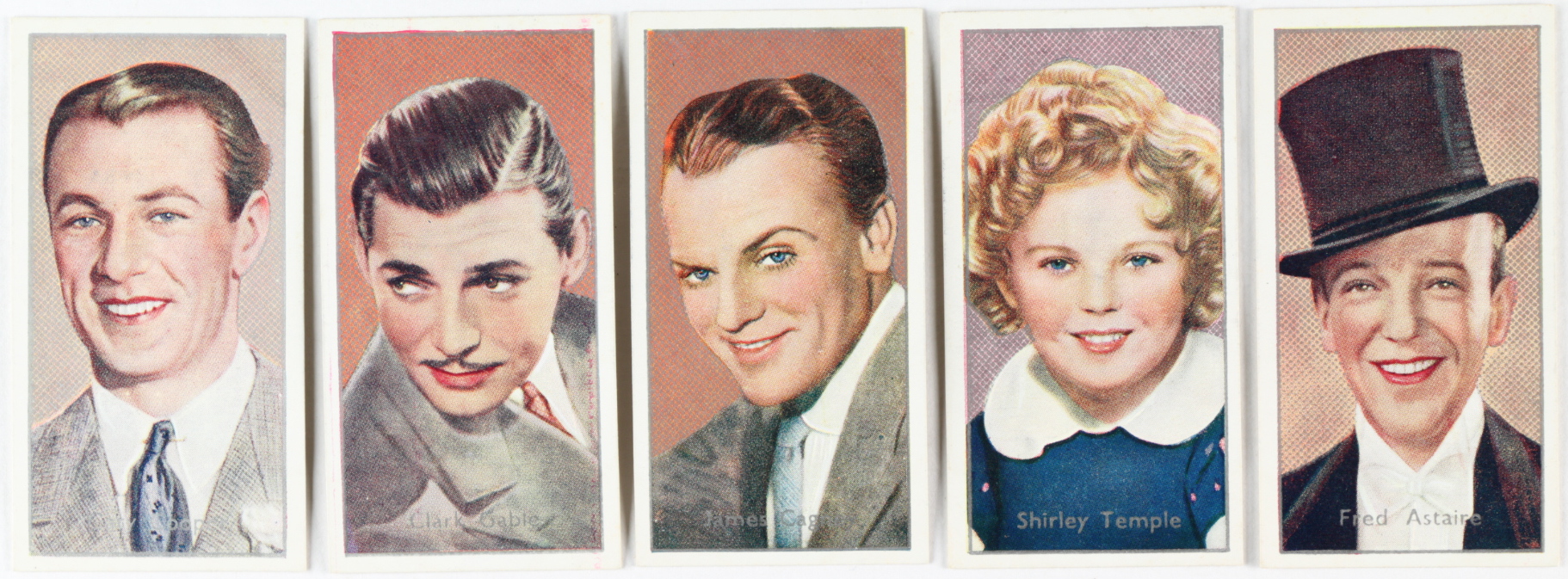 1936 Carreras "Film Stars" Complete Set of (50) Cigarette Cards with James Cagney, Gary Cooper, Clark Gable, Fred Astaire, Shirley Temple