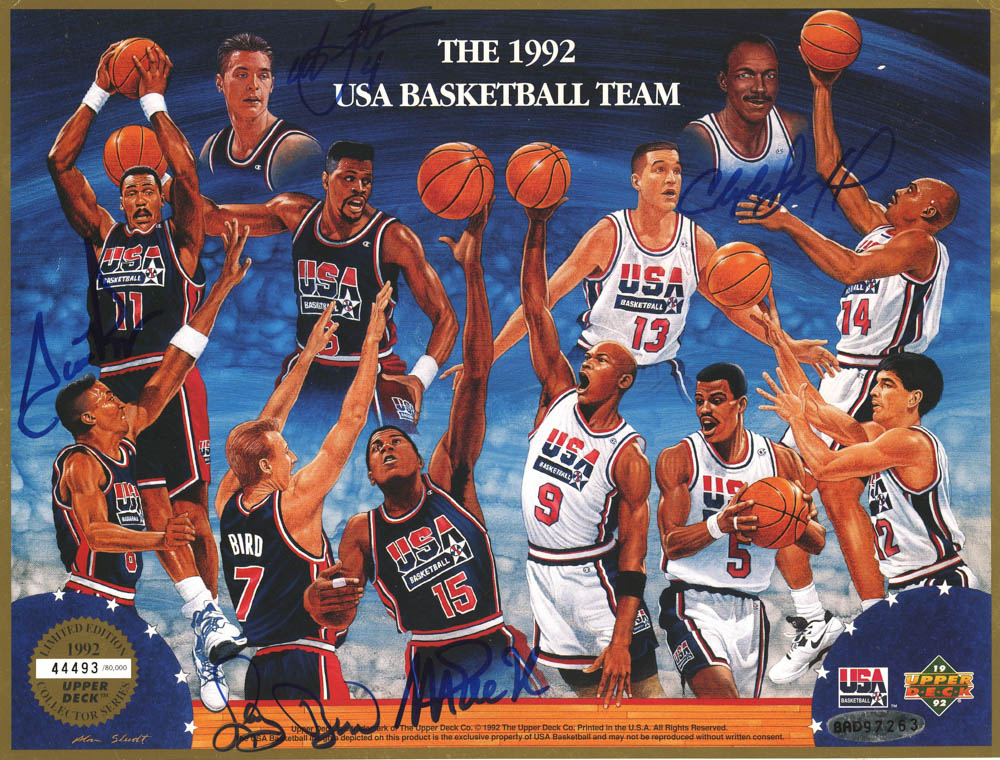 Print measures 8.5" x 11" in size and has been hand-signed by Magic Johnson (Los Angeles Lakers, HOF), Larry Bird (Boston Celtics, HOF), Charles Barkley (Phoenix Suns, HOF), David Robinson (San Antonio Spurs, HOF) and Christian Laettner (Duke Blue Devils),